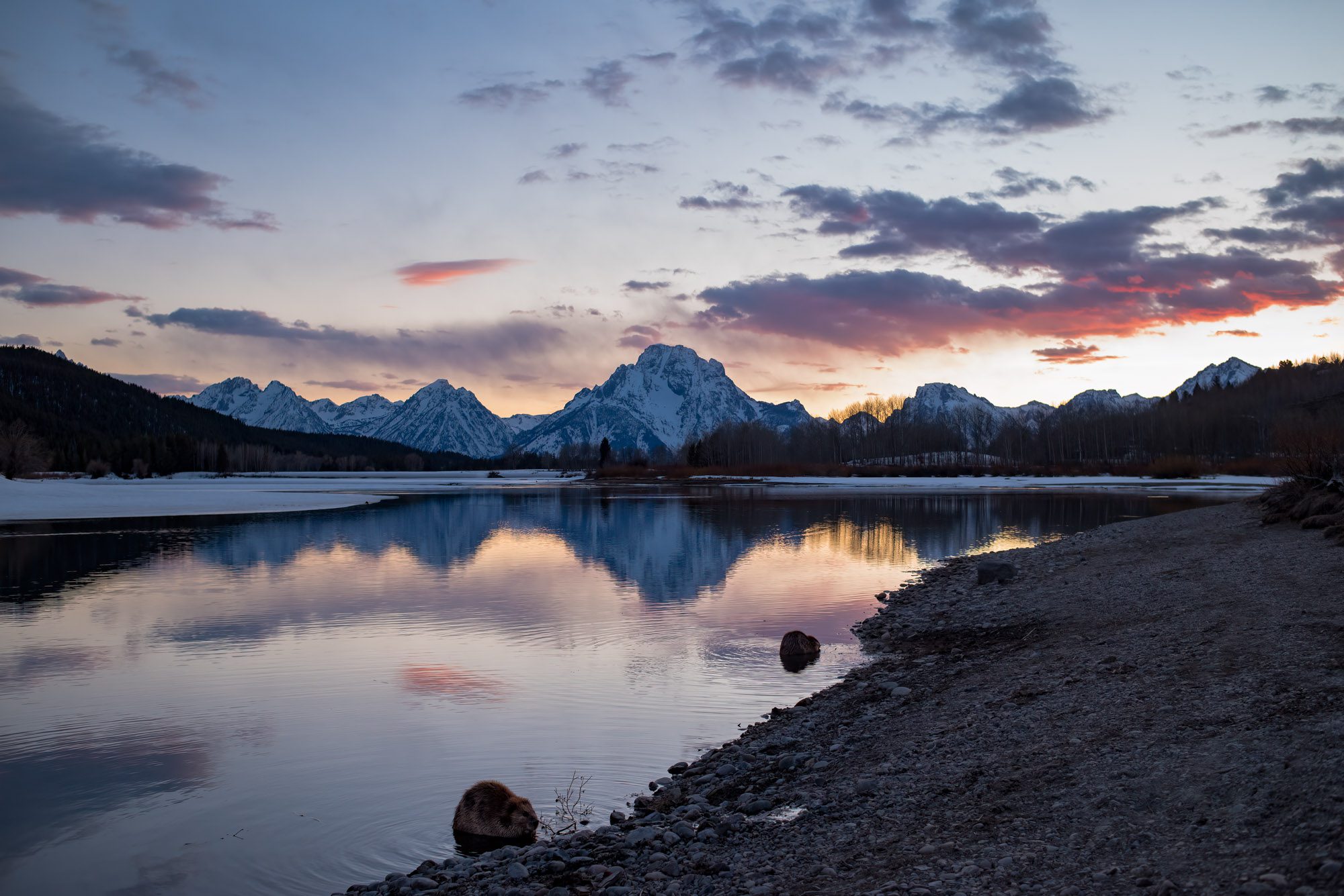 Experience the charm of Grand Teton’s wildlife with this stunning photograph of beavers at Oxbow Bend. These industrious creatures, known for their incredible ability to shape the landscape, are seen here chewing on willow twigs—an essential part of their survival and habitat-building process. Beavers use their powerful teeth to cut down trees for food and to construct their intricate dams and lodges.