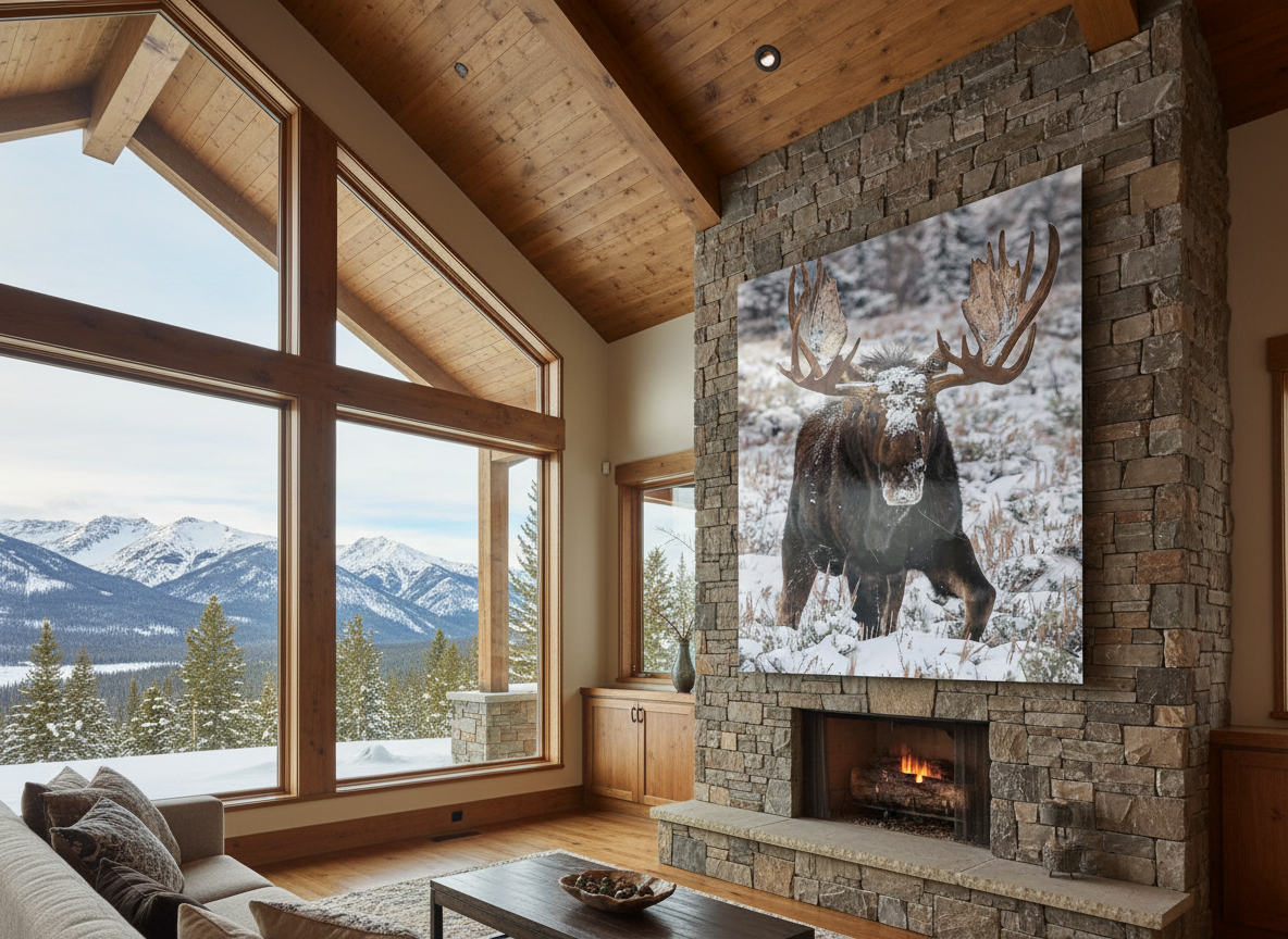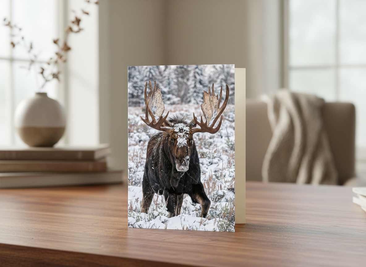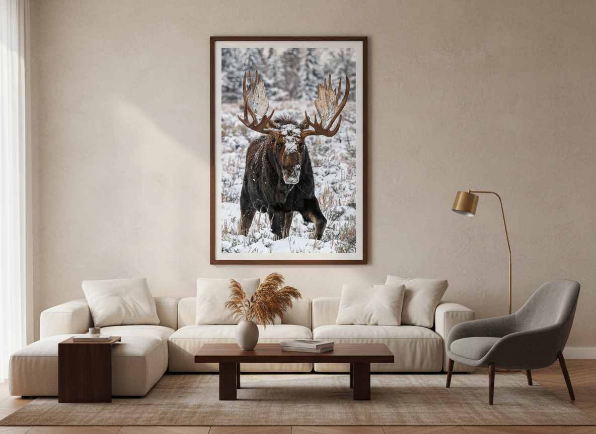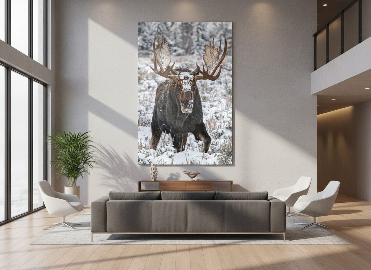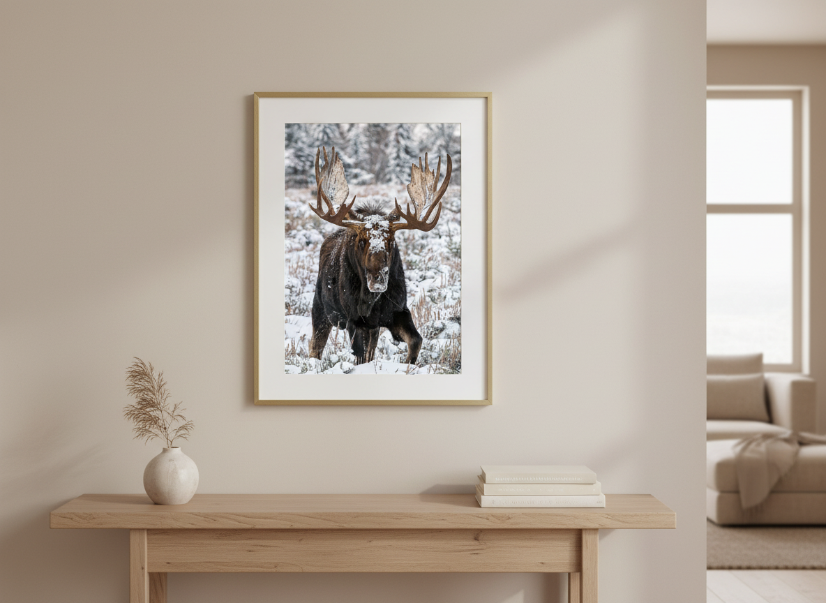 Capture the rugged beauty of winter in Grand Teton National Park with this stunning photograph of a bull moose at Dornan’s in Moose, WY. Living in this incredible area since 2010, I’ve had countless opportunities to observe and photograph the majestic wildlife that thrives in our harsh winters. The moose, drawn to the snowy landscapes of our park, represent the spirit of the Tetons in wintertime. Known for their preference for colder climates, moose are well adapted to the heavy snow and frigid temperatures, making them a common sight here in Moose, WY. This photograph beautifully showcases the powerful presence of a bull moose in its natural habitat.