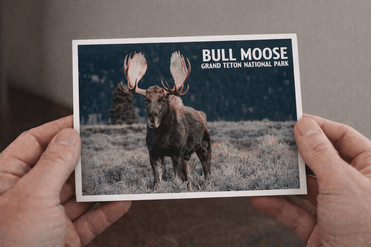 This postcard presents a commanding bull moose standing tall in Grand Teton National Park, showcasing the raw strength and presence of one of the Tetons’ most sought-after wildlife species.