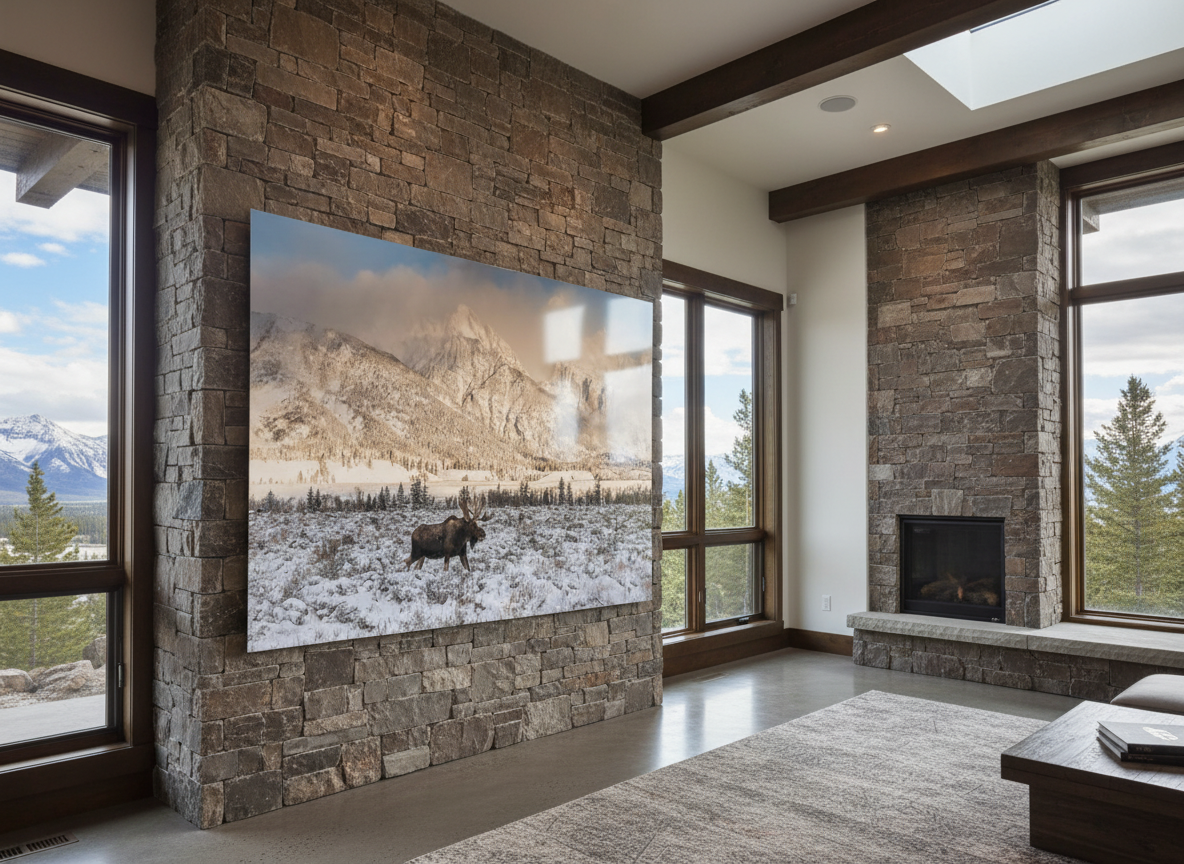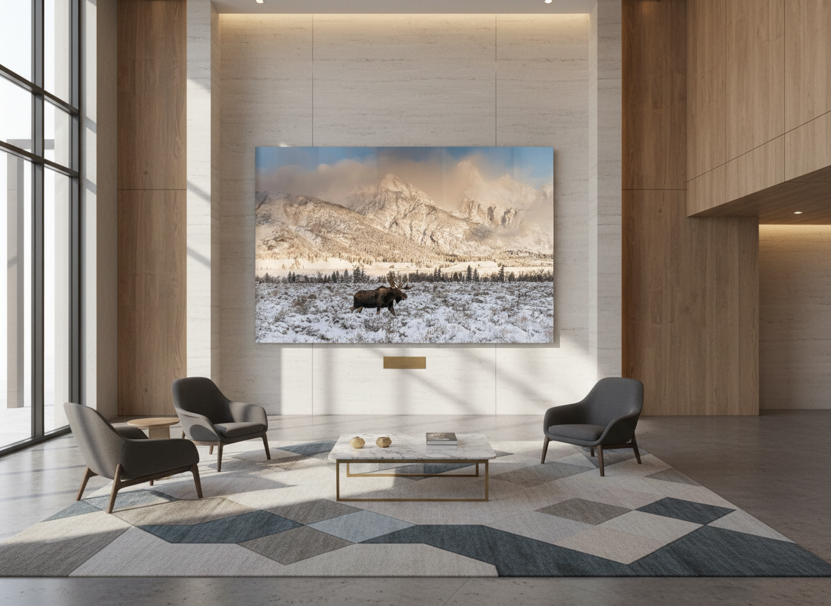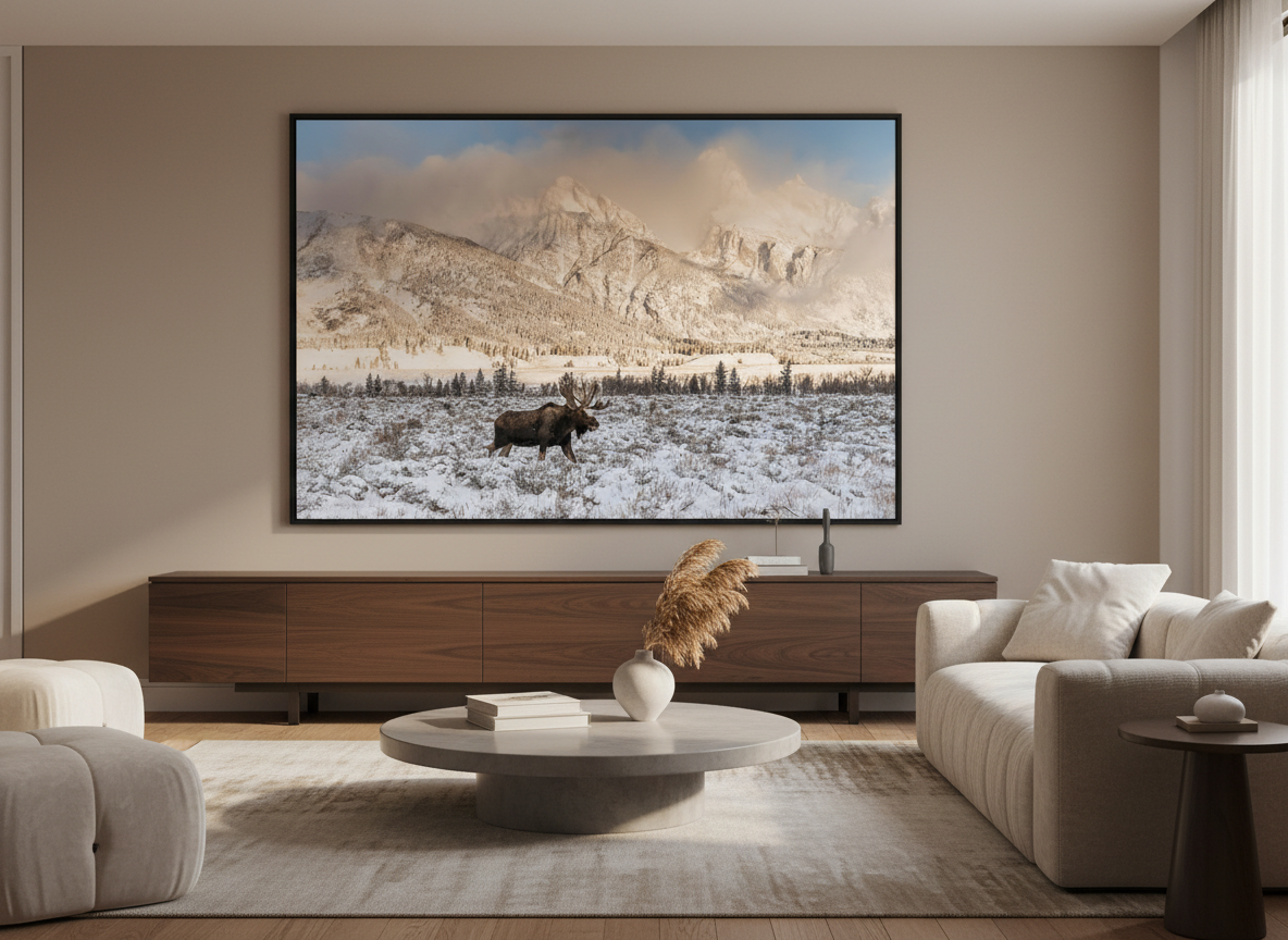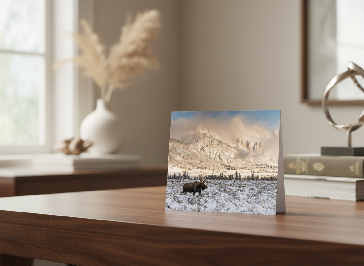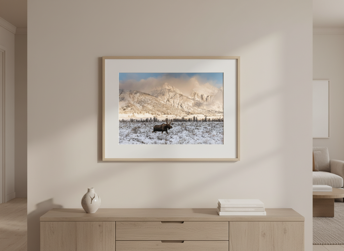 Bring the wild beauty of Grand Teton National Park into your home with this stunning photograph of a bull moose in winter. Taken near Dornan’s in Moose, WY, this image captures the sheer power and resilience of the largest member of the deer family. With the snow-covered Tetons as a breathtaking backdrop, this scene reflects the true spirit of the American West.
