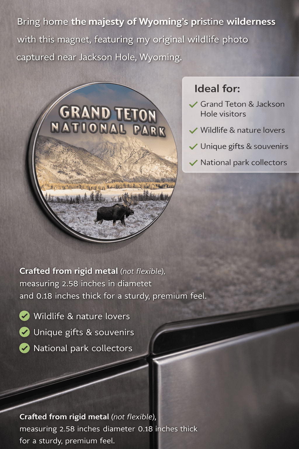 Perfect for refrigerators, filing cabinets, lockers, or any magnetic surface, this magnet makes a meaningful souvenir or gift for anyone who loves national parks, wildlife, Wyoming, or the Tetons.