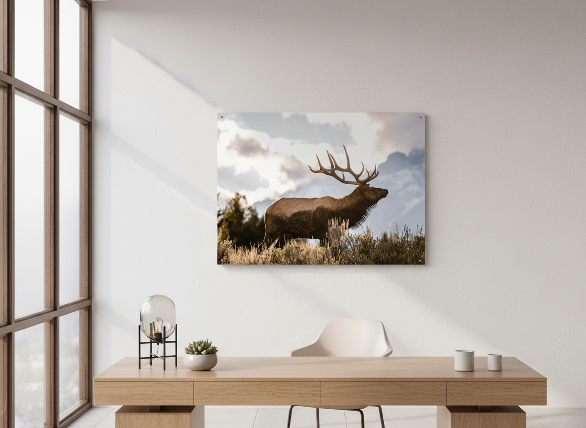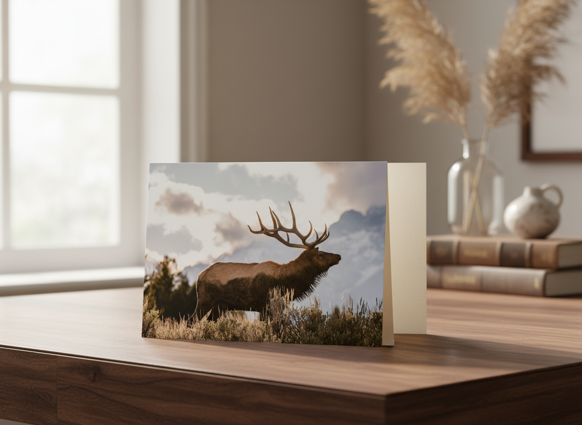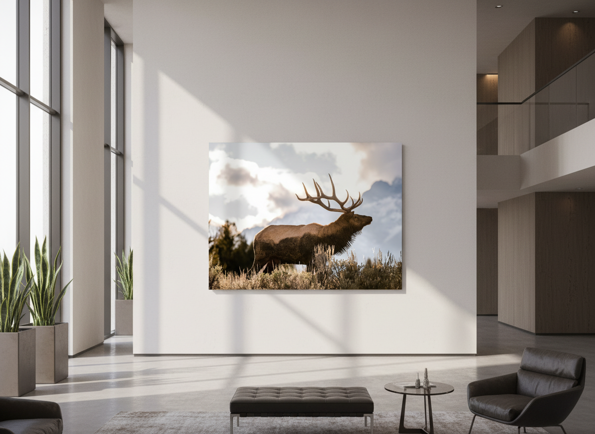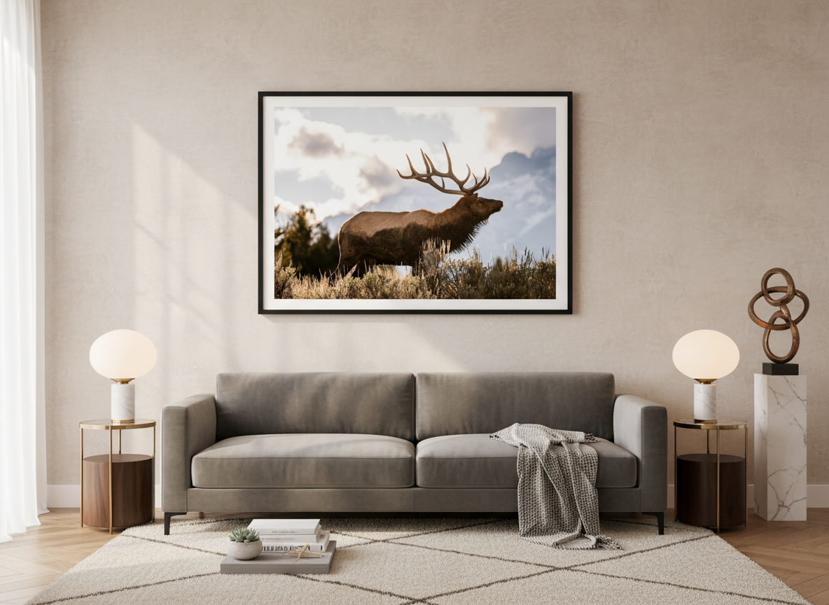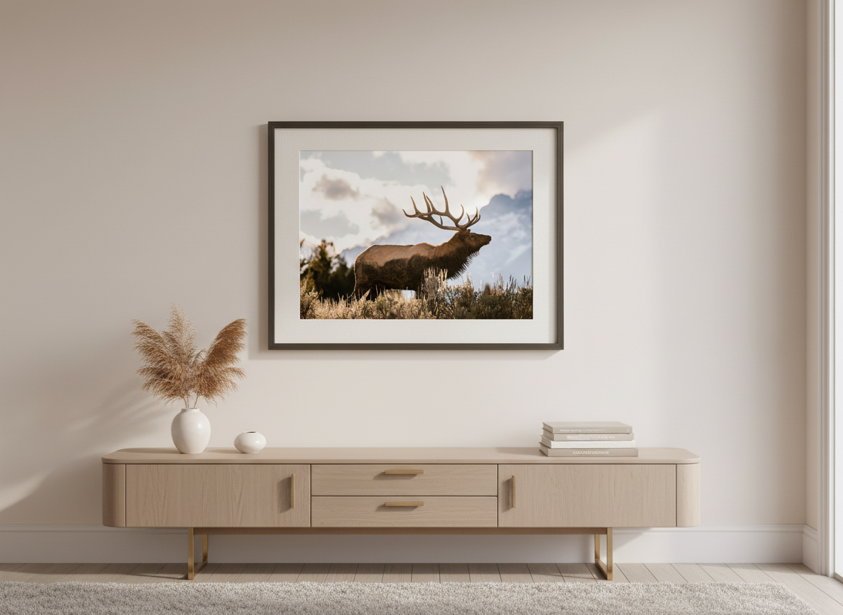 This captivating photograph features a bull elk in the wilds of Grand Teton National Park. Captured during the summer, this majestic creature gazes across the pristine landscape, embodying the untamed beauty of the region. Elk in the Jackson Hole herd winter at the National Elk Refuge and spend their summers in the high elevations of Grand Teton and Yellowstone National Park. Known for their impressive antlers, male elk shed them each year, adding to the natural cycle of life in this incredible wilderness. Perfect for wildlife enthusiasts and lovers of the Grand Teton’s stunning vistas, this image is a beautiful representation of the area’s wild spirit.