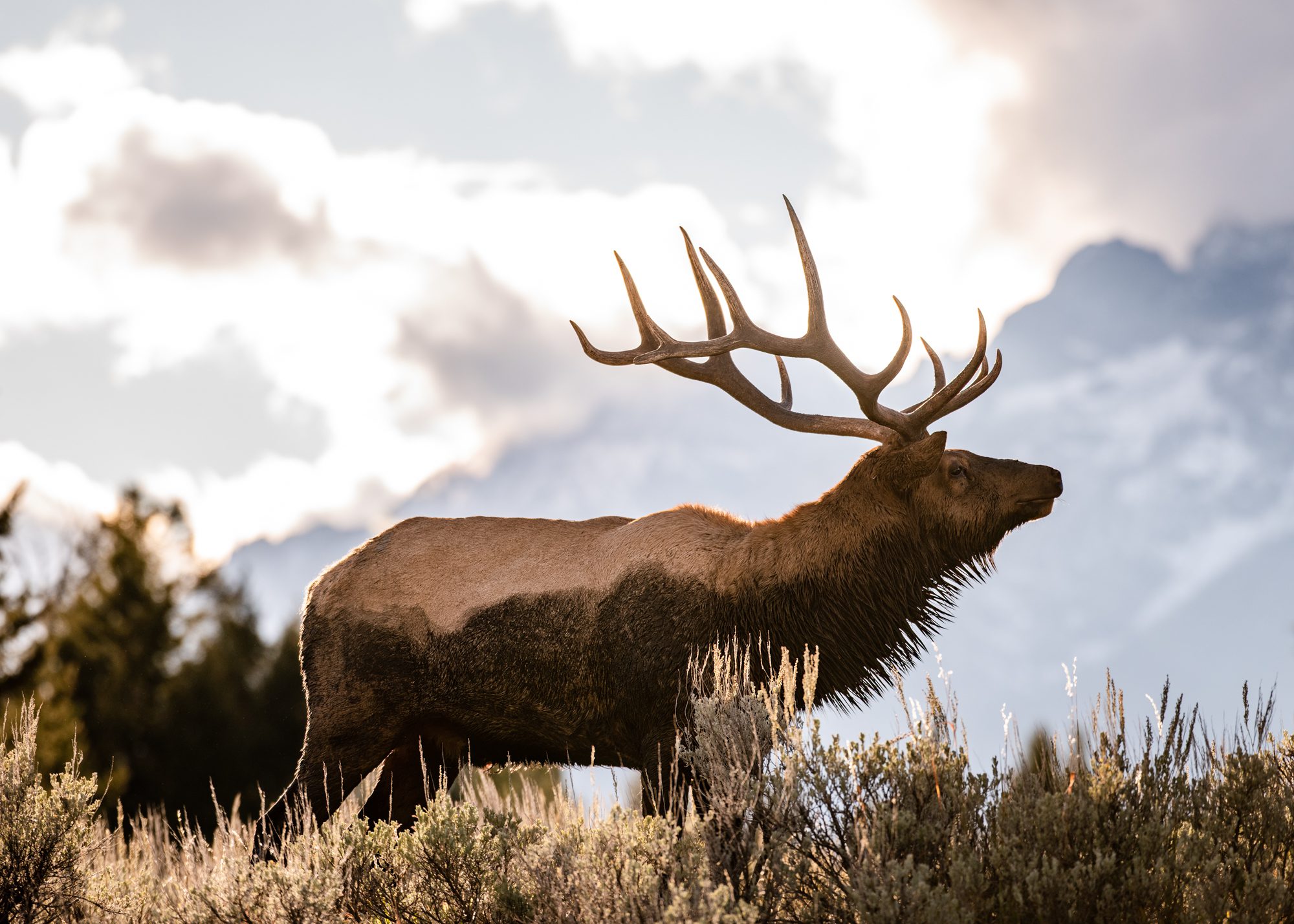 This captivating photograph features a bull elk in the wilds of Grand Teton National Park. Captured during the summer, this majestic creature gazes across the pristine landscape, embodying the untamed beauty of the region. Elk in the Jackson Hole herd winter at the National Elk Refuge and spend their summers in the high elevations of Grand Teton and Yellowstone National Park. Known for their impressive antlers, male elk shed them each year, adding to the natural cycle of life in this incredible wilderness. Perfect for wildlife enthusiasts and lovers of the Grand Teton’s stunning vistas, this image is a beautiful representation of the area’s wild spirit.