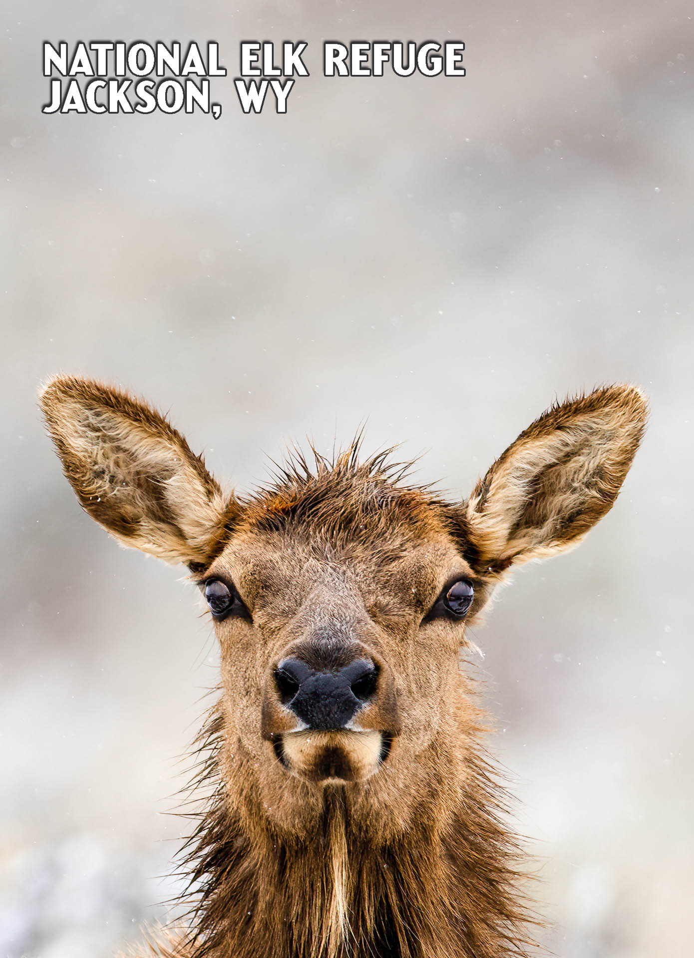 This close-up portrait highlights the expressive eyes and textured winter coat of a cow elk, capturing the quiet beauty of winter in the National Elk Refuge.