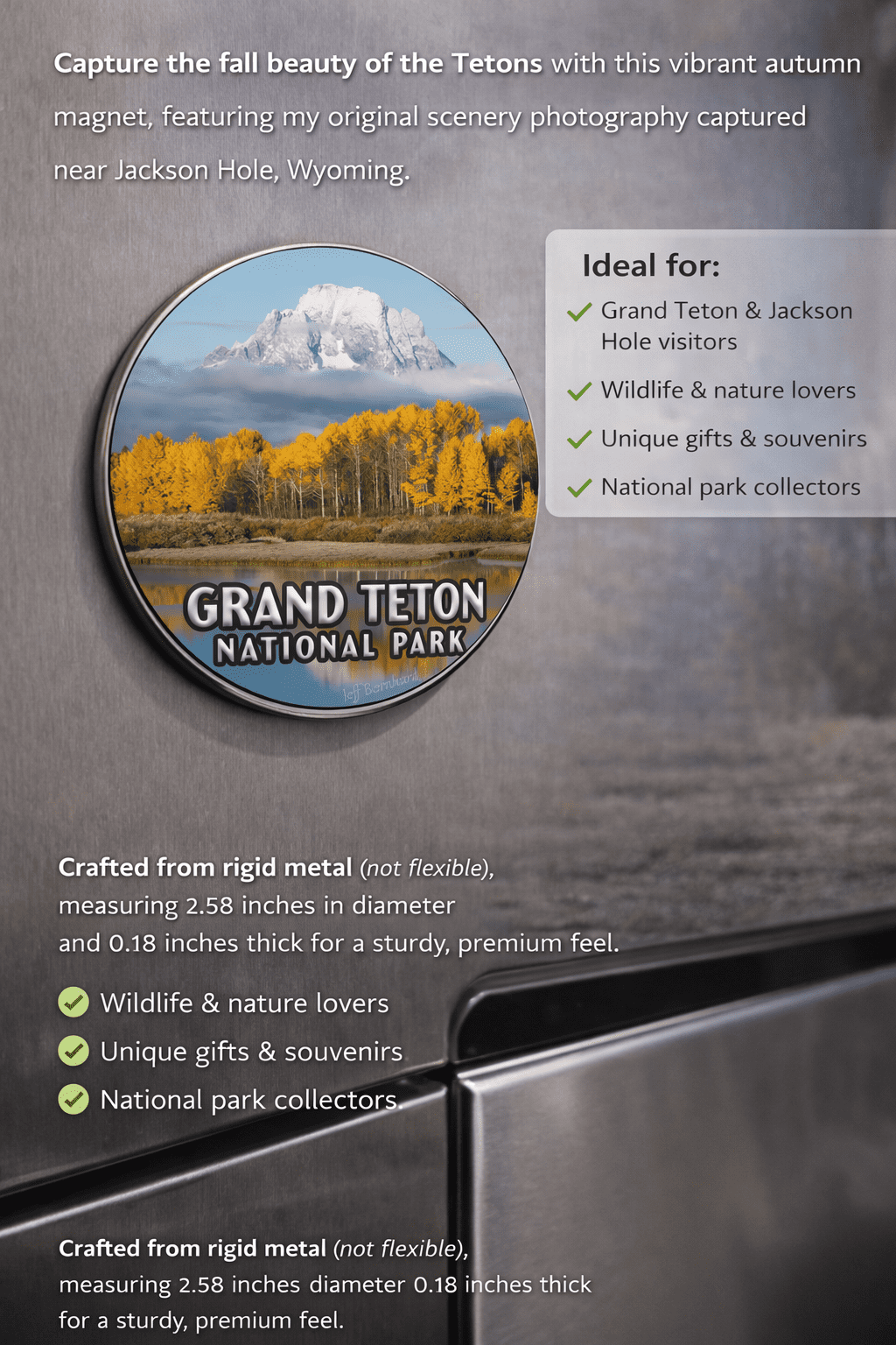 Perfect for refrigerators, lockers, filing cabinets, or any magnetic surface, this magnet makes a meaningful souvenir or gift for anyone who loves national parks, fall landscapes, Wyoming, or mountain photography.