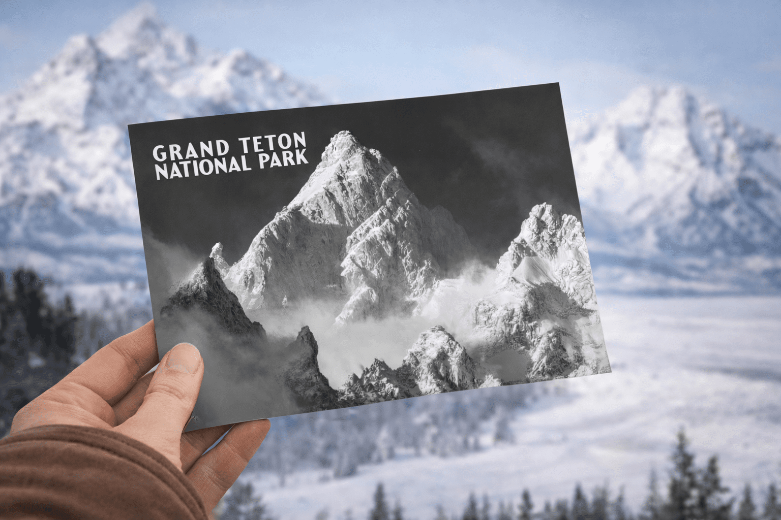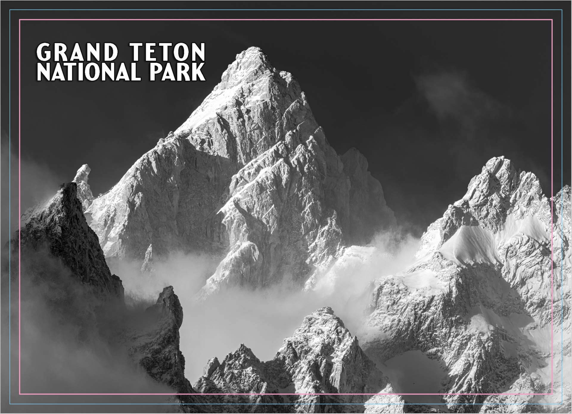 This dramatic fine art postcard captures the raw power and timeless beauty of the Grand Teton mountain range in stunning black and white. Towering granite spires pierce through swirling alpine mist, creating a scene of depth, contrast, and quiet intensity that feels both modern and classic.