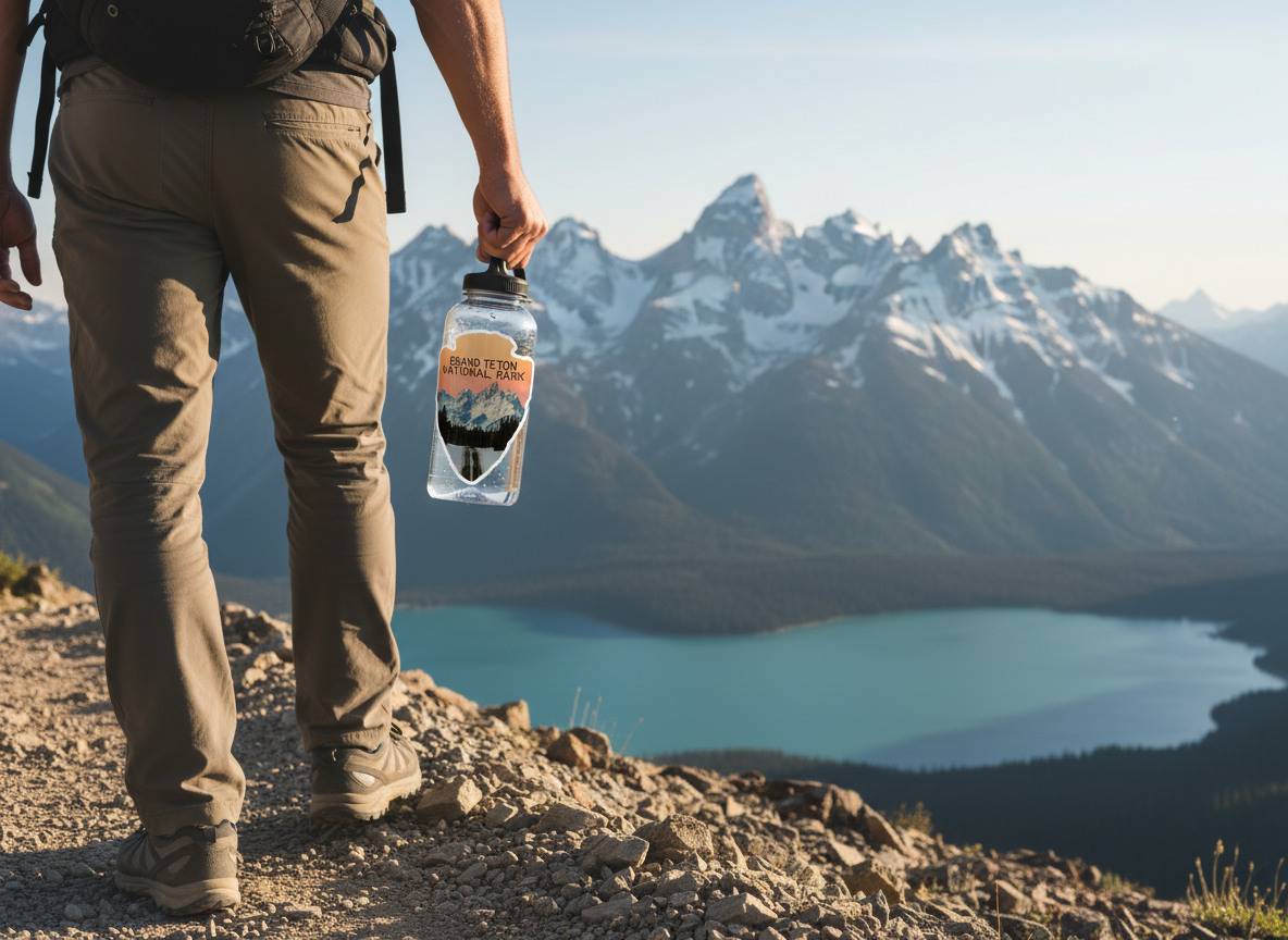 Inspired by classic national park emblems, this arrowhead design captures the Tetons glowing in early morning light — one of the most iconic views in Jackson Hole.