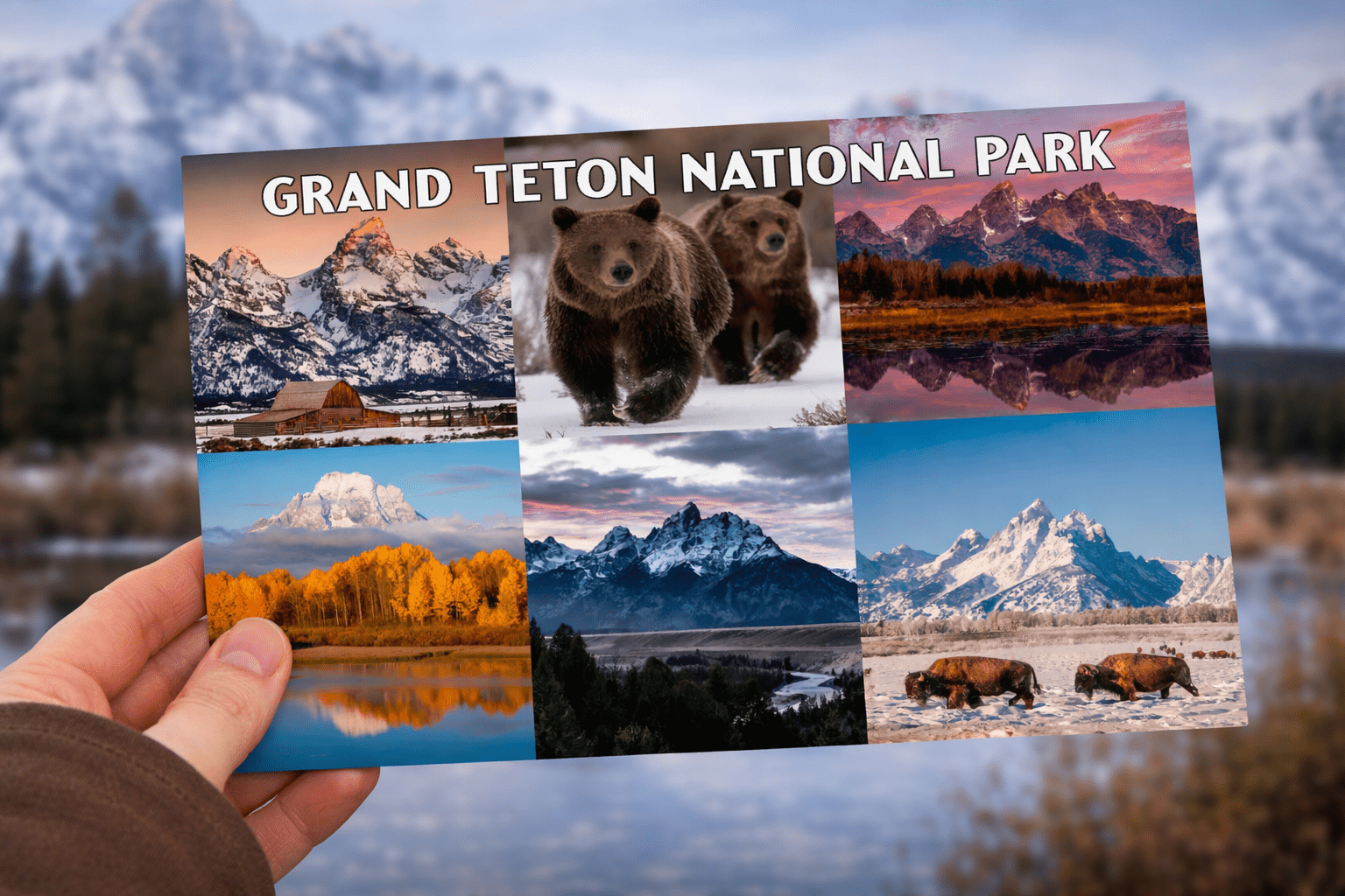 This striking postcard collage captures the very soul of Grand Teton National Park in one unforgettable composition. Featuring towering mountain peaks, dramatic alpine light, reflective river valleys, golden fall aspens, and iconic wildlife including grizzly bears and bison, this design tells the full story of the Tetons in a single, powerful image.