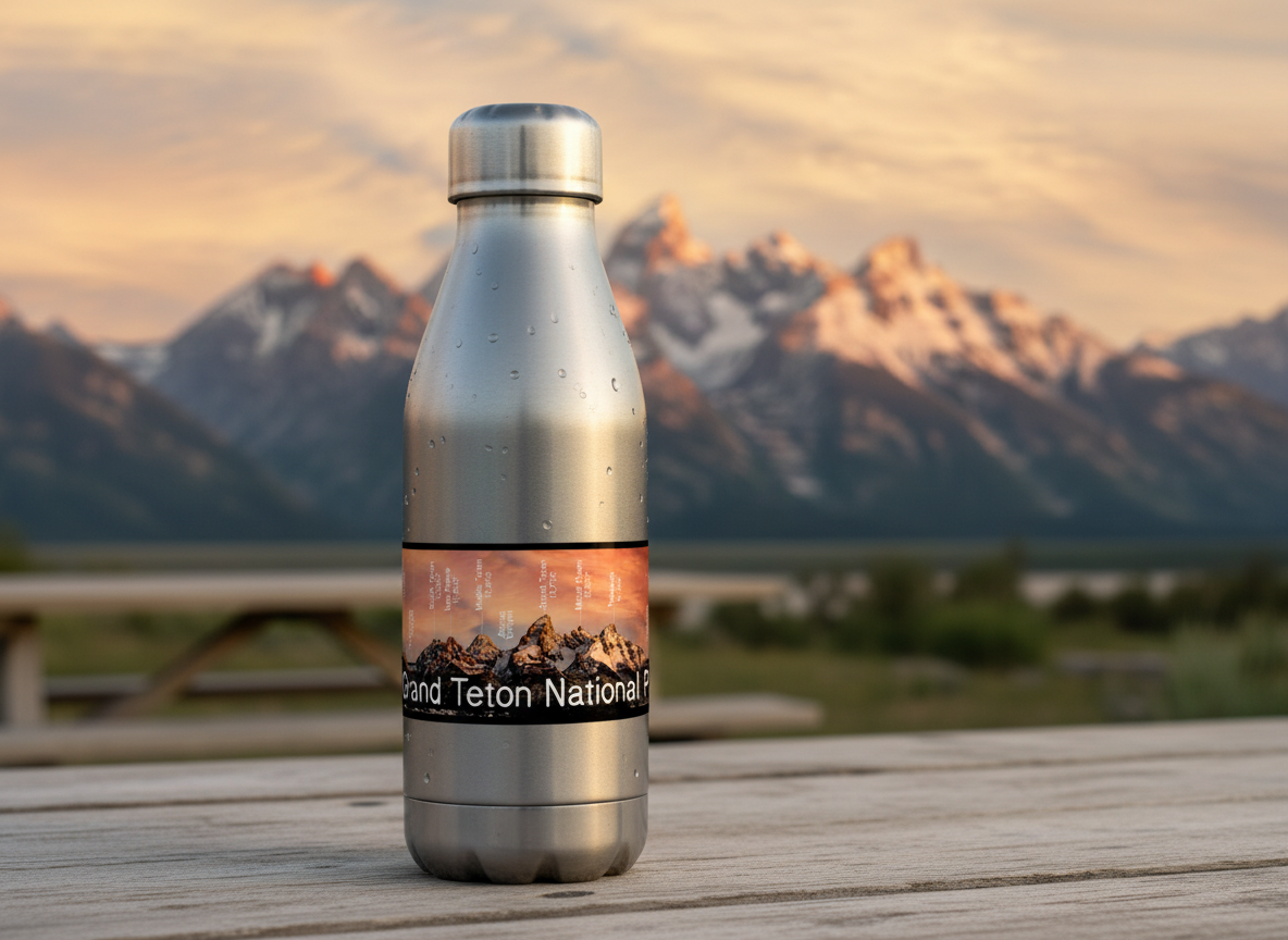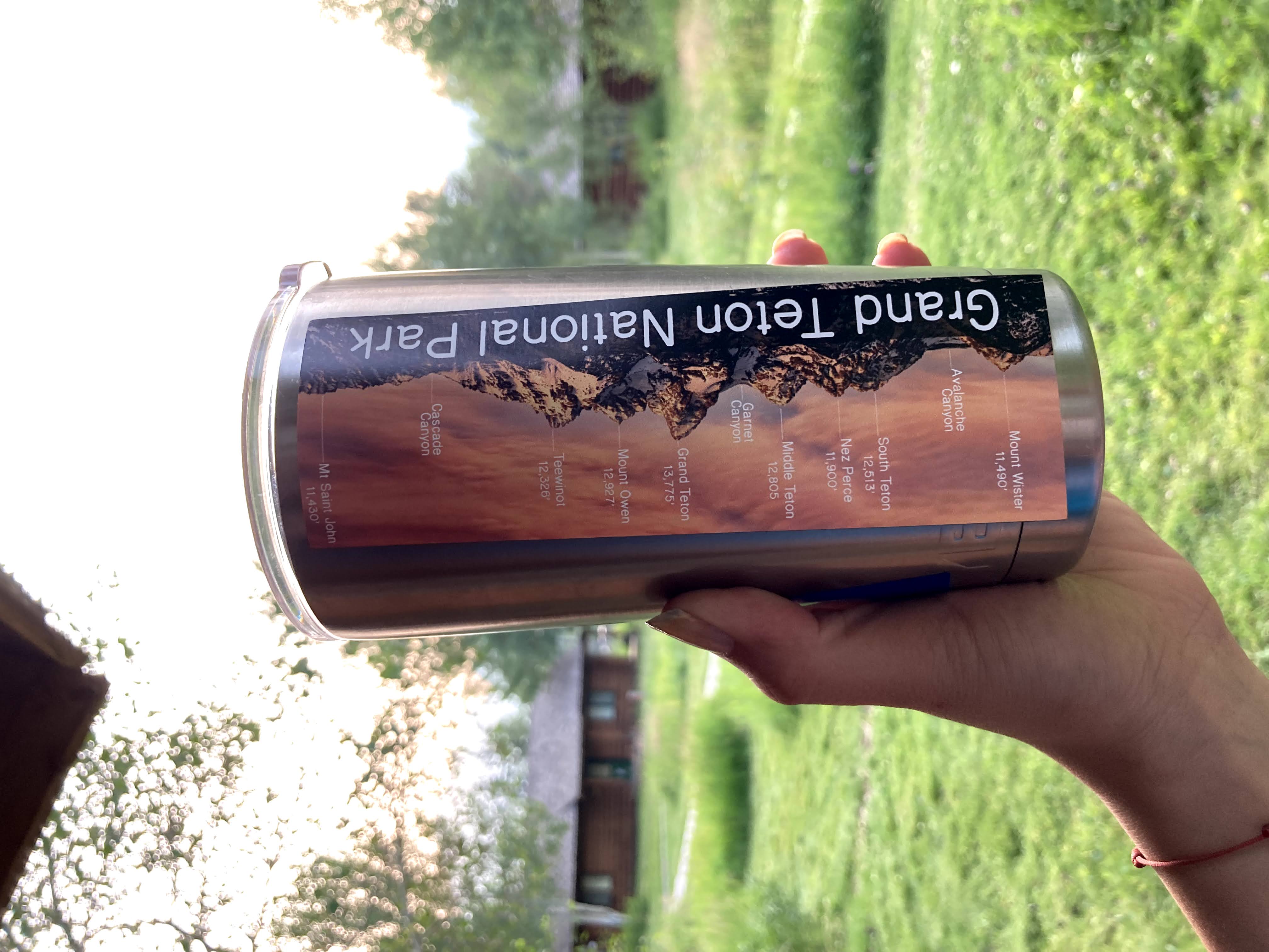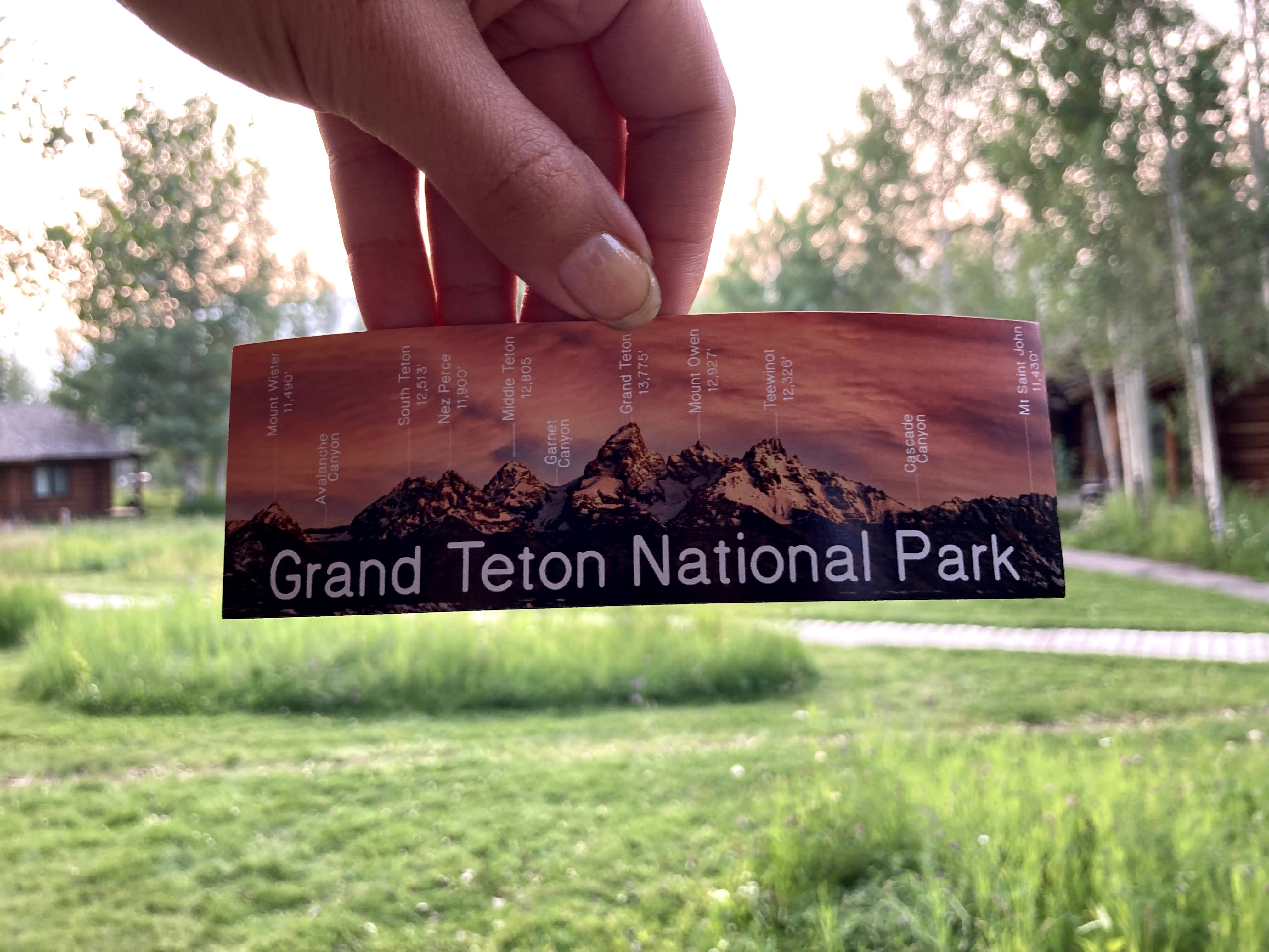 Bring home the beauty of Grand Teton National Park with this sticker or magnet, featuring a labeled photograph of the Teton mountain range at sunrise. The peaks and their elevations are clearly marked, making this a useful and stunning souvenir for hikers, climbers, and nature lovers.