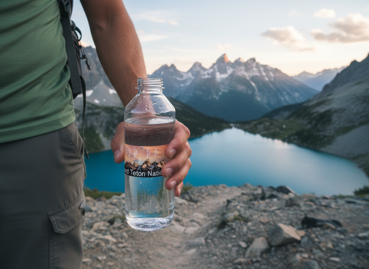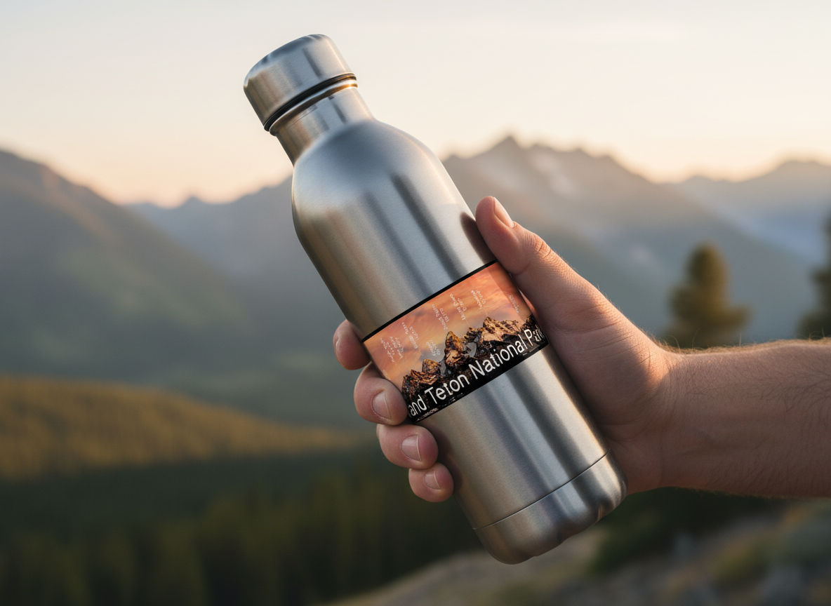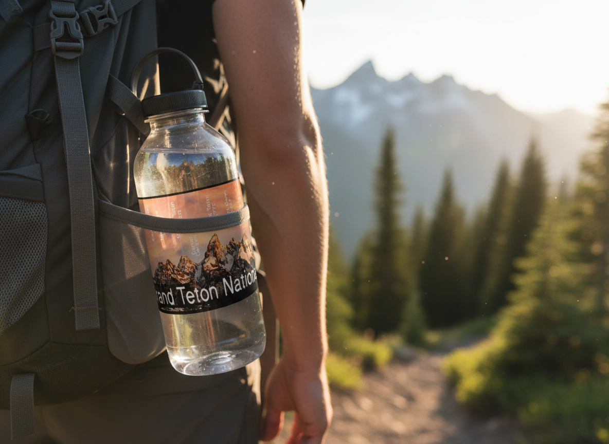 Bring home the beauty of Grand Teton National Park with this sticker or magnet, featuring a labeled photograph of the Teton mountain range at sunrise. The peaks and their elevations are clearly marked, making this a useful and stunning souvenir for hikers, climbers, and nature lovers.