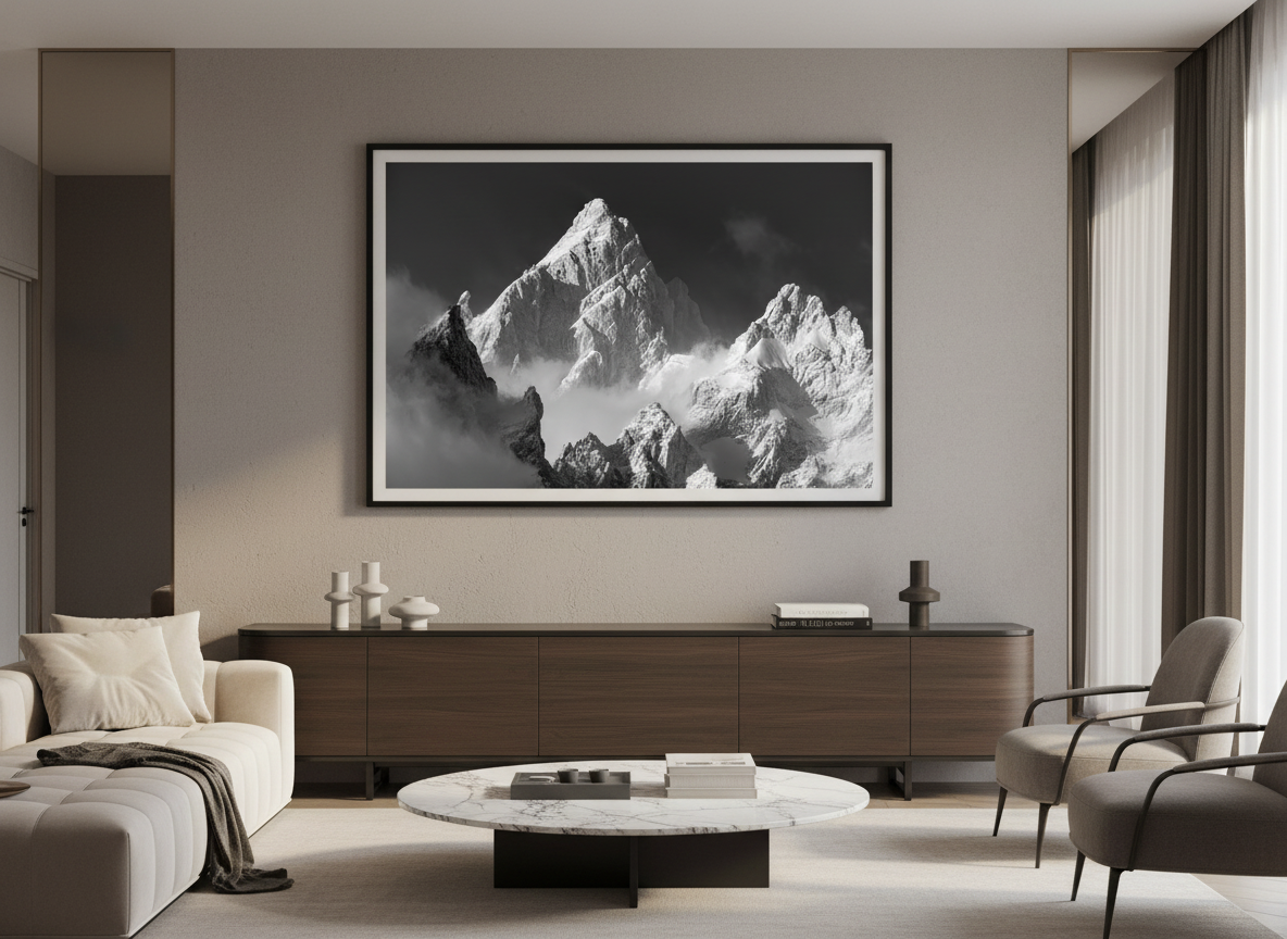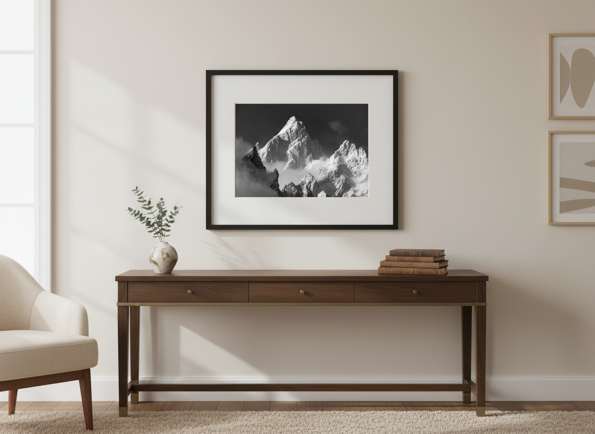 Experience the raw beauty of Grand Teton National Park with this striking black-and-white photograph of its towering peaks. The Grand Teton Summits B+W Photograph captures the dramatic energy of the highest mountains in the range, surrounded by moody clouds that add depth and mystery to the scene. Living in the park since 2010, I’ve spent countless hours exploring these majestic peaks, and this image represents the unique, ever-changing atmosphere that defines the Tetons. Printed on high-quality materials, this photo will bring the wild beauty of this iconic landscape to your home.