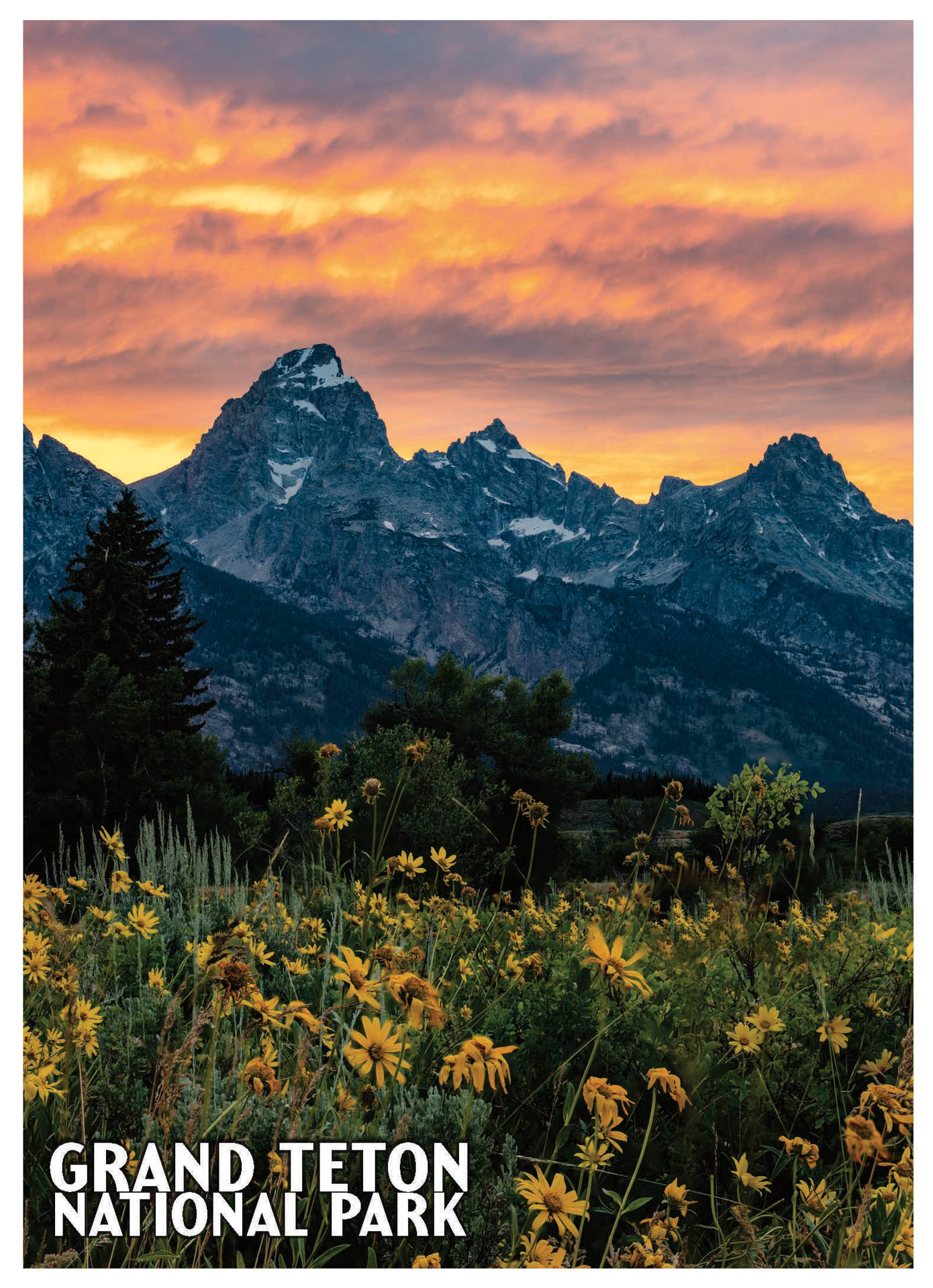Bring home the unforgettable beauty of the Tetons with this striking Grand Teton Wildflowers Sunset Postcard, captured during peak summer bloom in Grand Teton National Park.