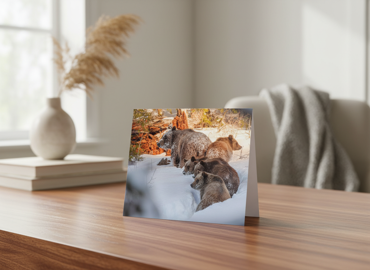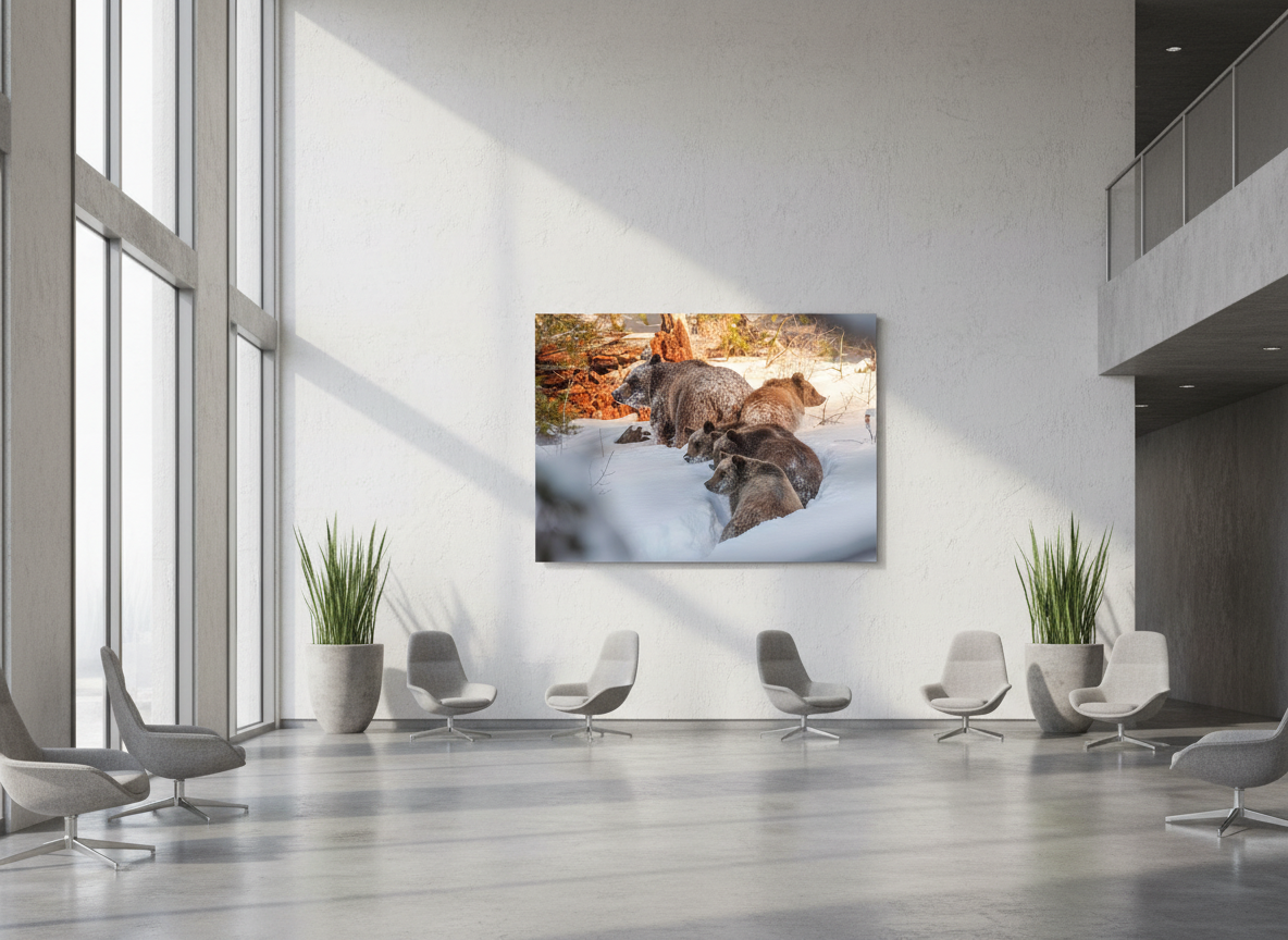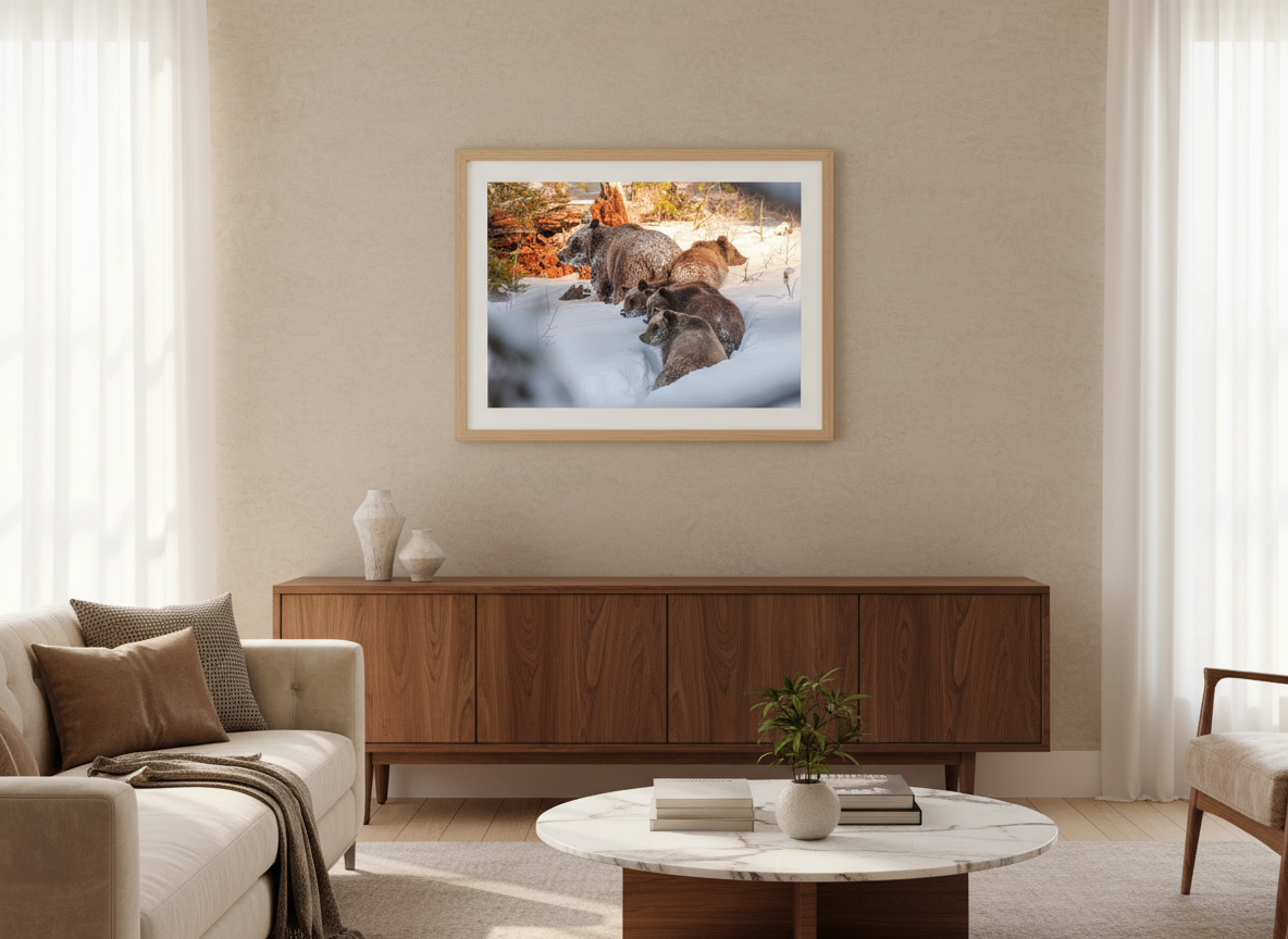 Grizzly Bear 399, the legendary matriarch of Grand Teton National Park, is seen here with her four cubs trekking through the winter landscape on December 31, 2020. Born in 1996, she has become the most famous grizzly in the world, symbolizing the resilience and importance of a healthy bear population. With at least 22 descendants, including cubs and grandcubs, 399 has shaped the future of grizzlies in the Greater Yellowstone Ecosystem. This stunning open-edition print captures a rare and unforgettable wildlife moment, perfect for any nature enthusiast or photography collector.