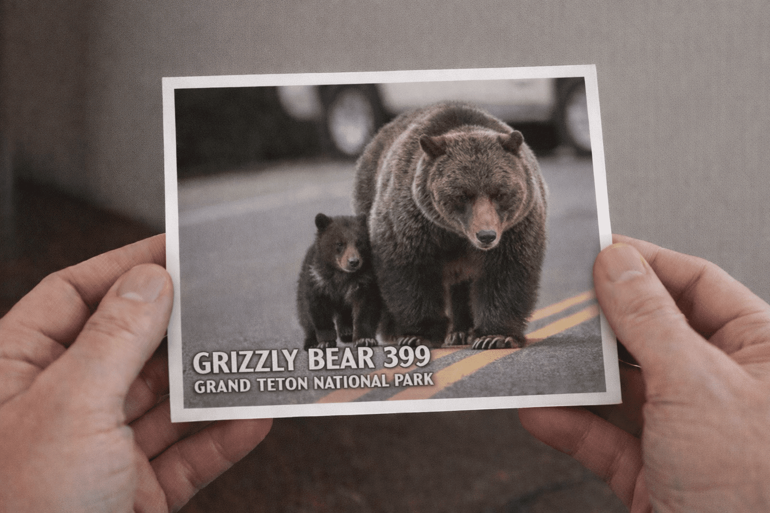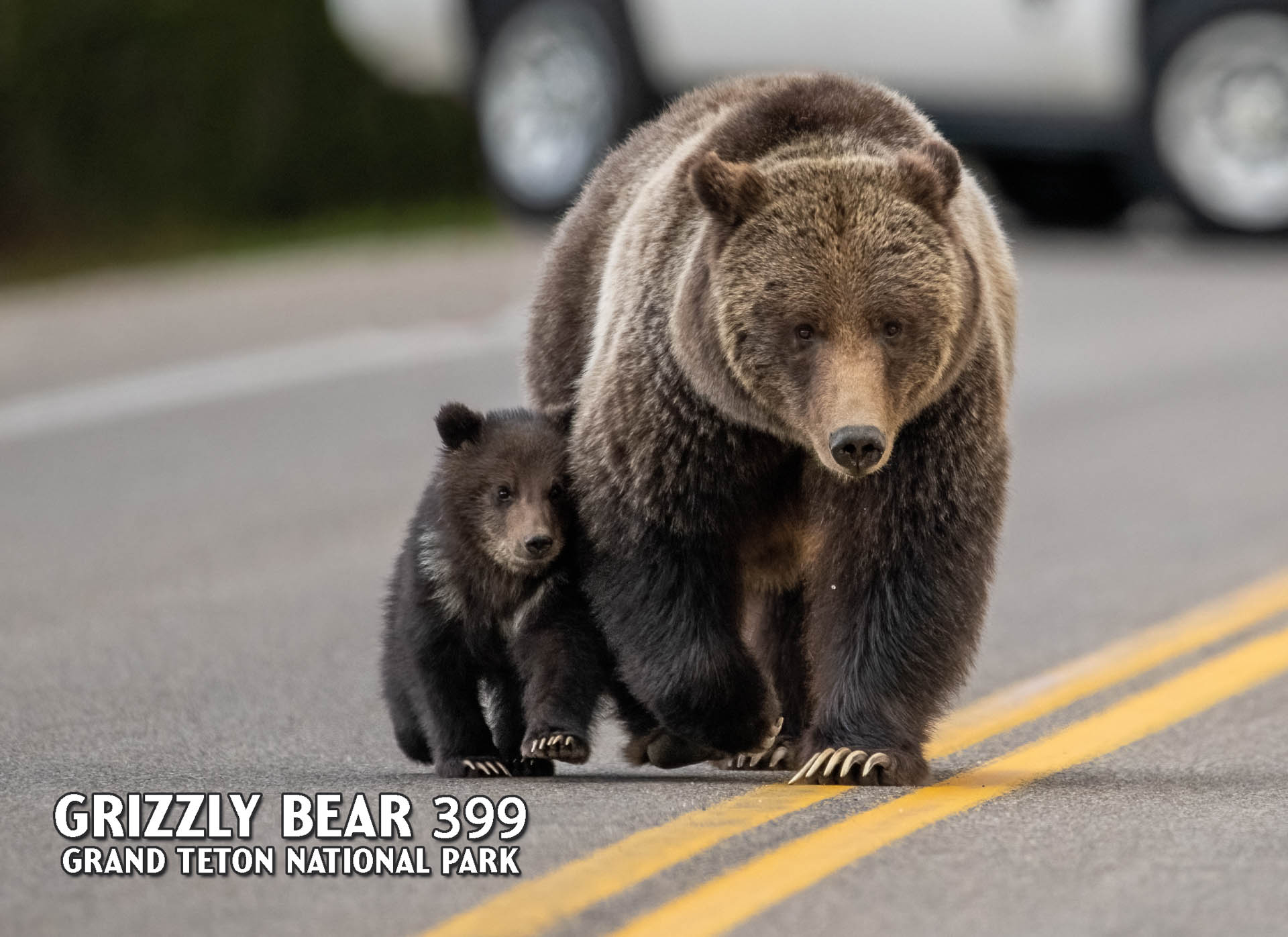 This powerful image captures legendary Grizzly Bear 399 walking alongside her cub in Grand Teton National Park. The road setting tells a real and recognizable story of coexistence between wildlife and visitors, making this one of the most iconic and emotionally resonant scenes in the Tetons.