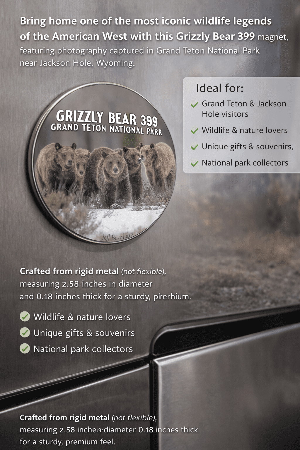 Bring home one of the most iconic wildlife legends of the American West with this Grizzly Bear 399 magnet, featuring my original photography captured in Grand Teton National Park near Jackson Hole, Wyoming.