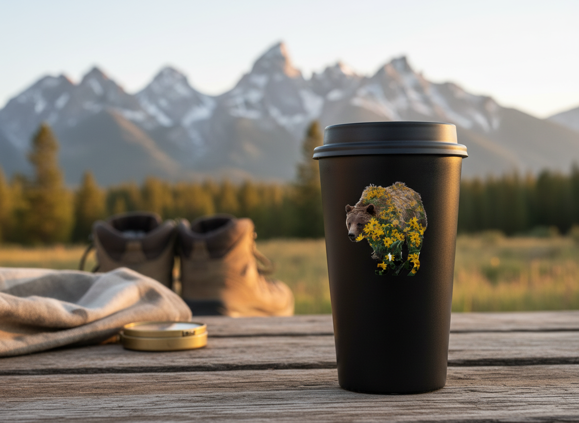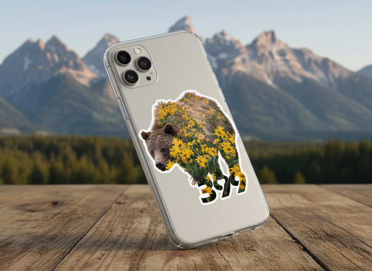 This sticker is based on an actual photo of famous grizzly bear 399 in Grand Teton National Park, Jackson Hole Wyoming. The sticker has a clear background once you peel it off the backing and measures 4″ x 3.5″. The durable vinyl sticker is resists scratching, heat, water, and sunlight, making it the perfect addition to any laptop, cell phone, water bottle etc…