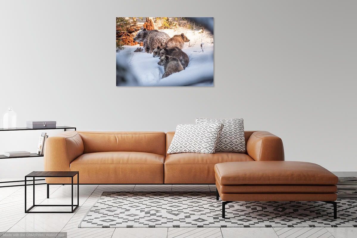 Grizzly Bear 399, the legendary matriarch of Grand Teton National Park, is seen here with her four cubs trekking through the winter landscape on December 31, 2020. Born in 1996, she has become the most famous grizzly in the world, symbolizing the resilience and importance of a healthy bear population. With at least 22 descendants, including cubs and grandcubs, 399 has shaped the future of grizzlies in the Greater Yellowstone Ecosystem. This stunning open-edition print captures a rare and unforgettable wildlife moment, perfect for any nature enthusiast or photography collector.