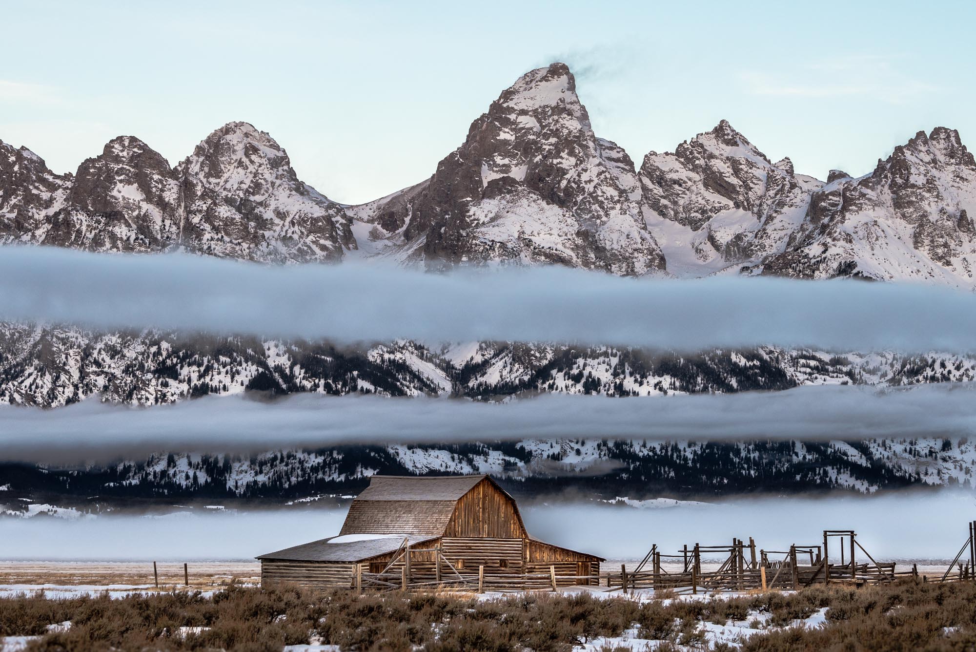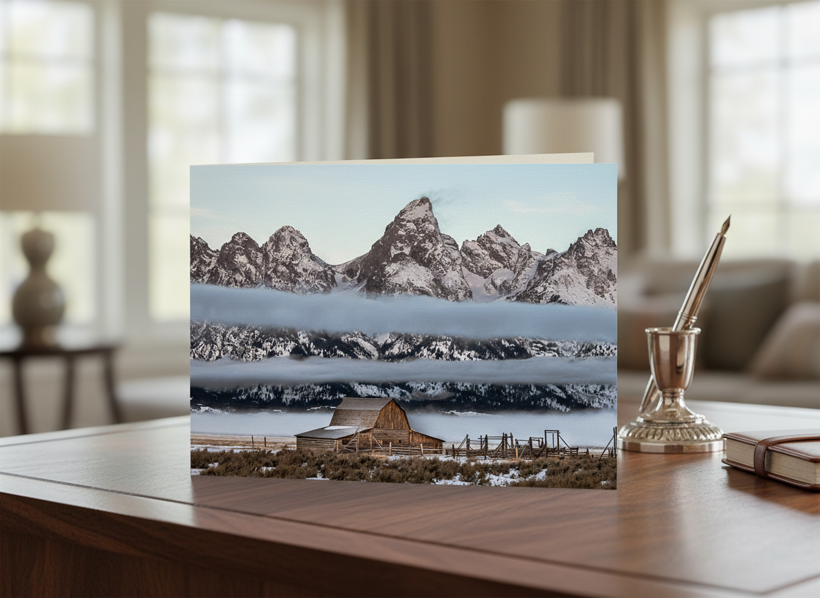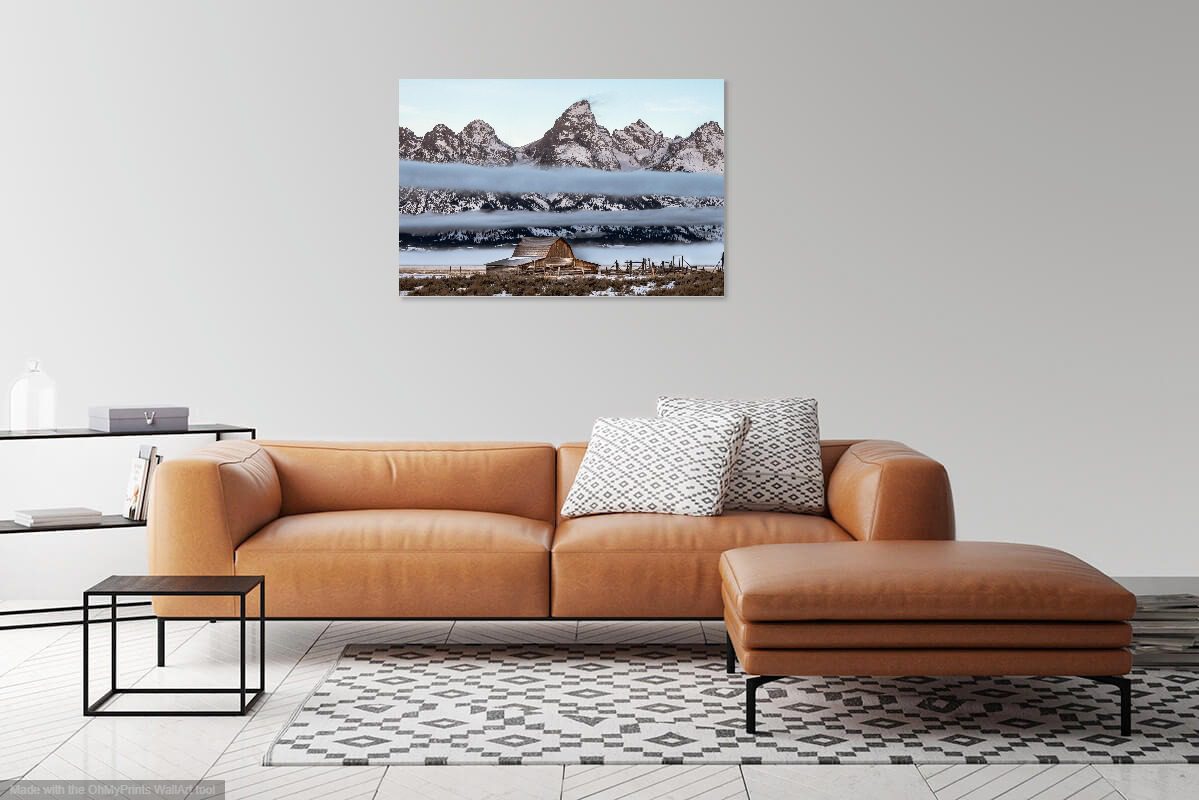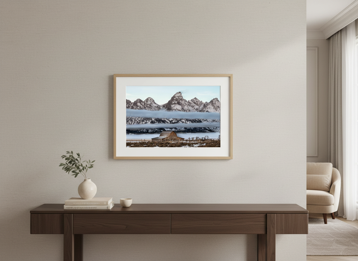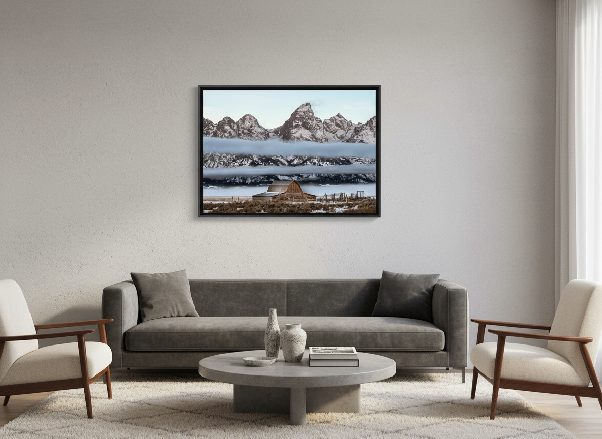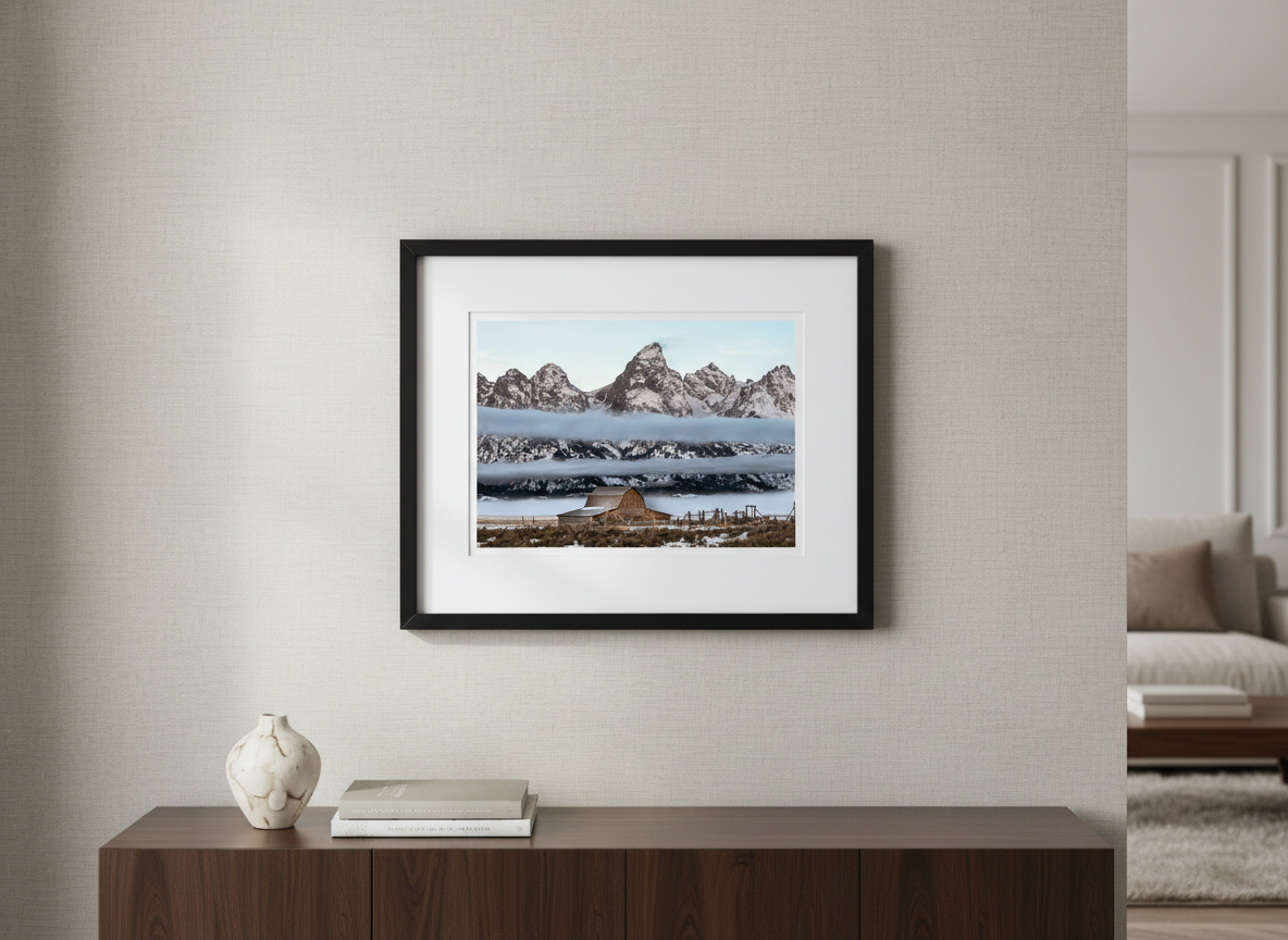 Experience the ethereal beauty of the John Moulton Barn, shrouded in delicate layers of fog, set against the stunning backdrop of Grand Teton National Park. This iconic barn, a favorite among photographers and history enthusiasts, emerges from the mist, creating a scene of tranquility and timelessness. Captured by a local photographer who has lived in the Tetons since 2010, this high-quality open-edition print brings the magic of this beloved location into your home.