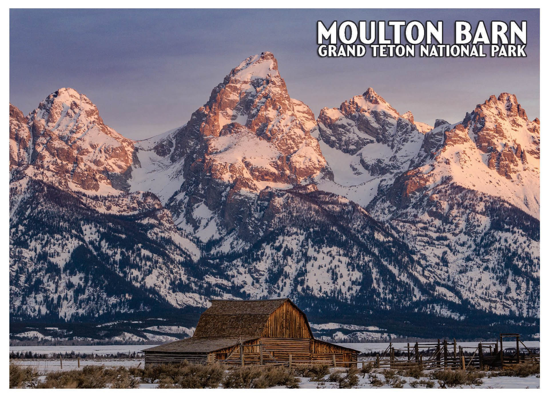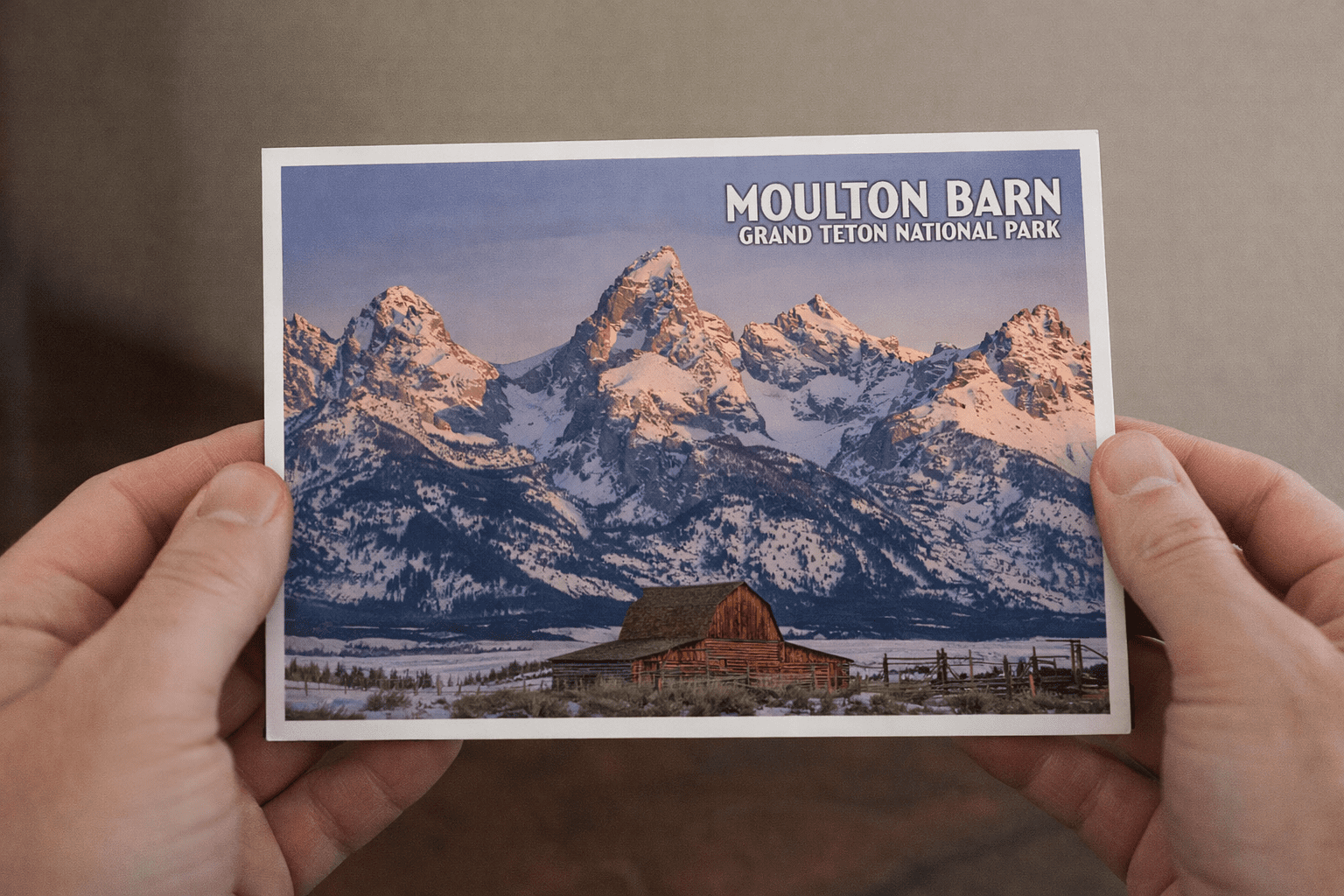This postcard features the iconic Moulton Barn set against the rugged peaks of the Teton Range in Grand Teton National Park. Warm morning light illuminates the historic wooden barn while snow-covered mountains rise dramatically in the background, capturing one of the most photographed and beloved scenes in the American West. A timeless image that represents the spirit, history, and breathtaking beauty of the Tetons.