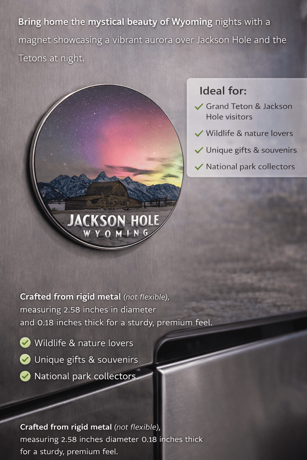 Perfect for refrigerators, lockers, filing cabinets, or any magnetic surface, this magnet makes a truly unforgettable souvenir or gift for anyone who loves Wyoming, the Tetons, astrophotography, or national parks.