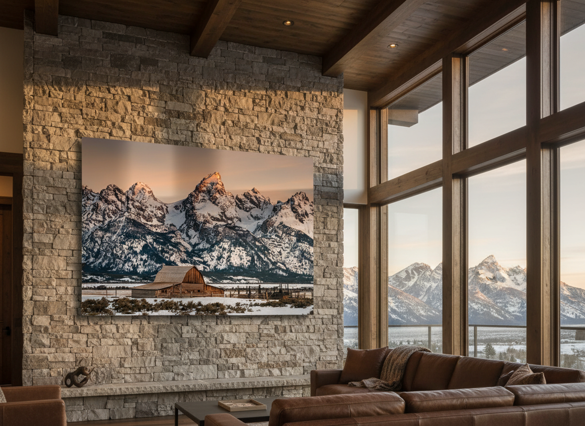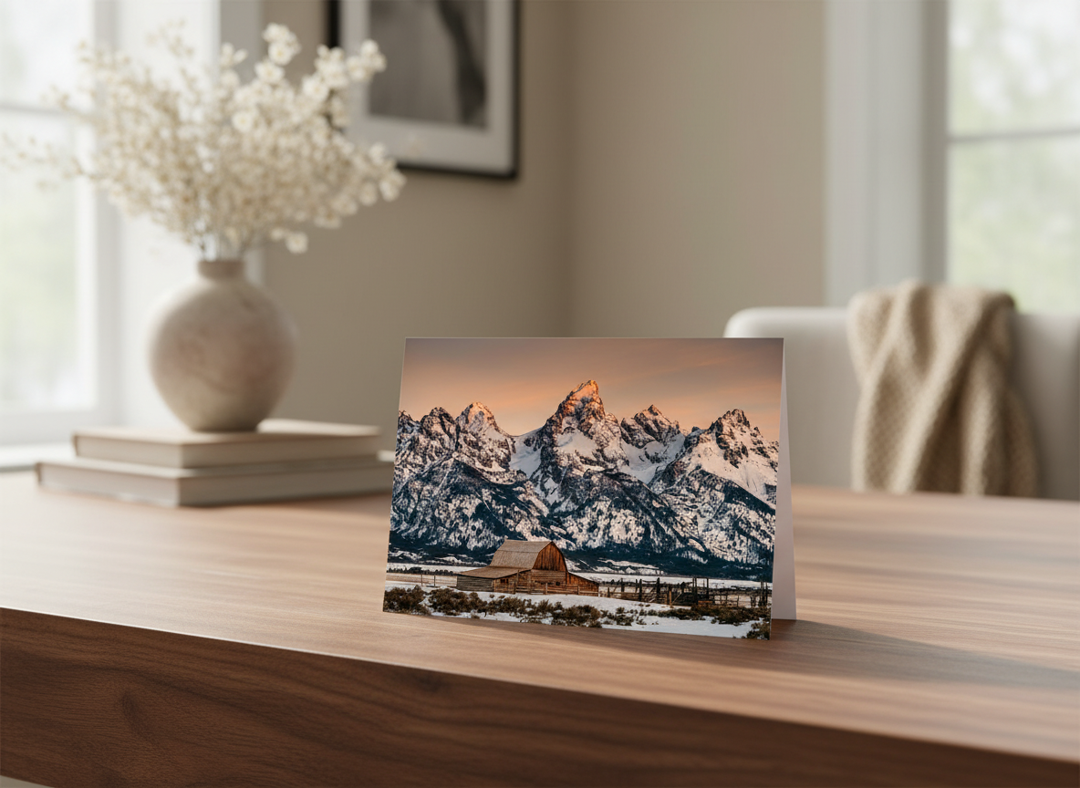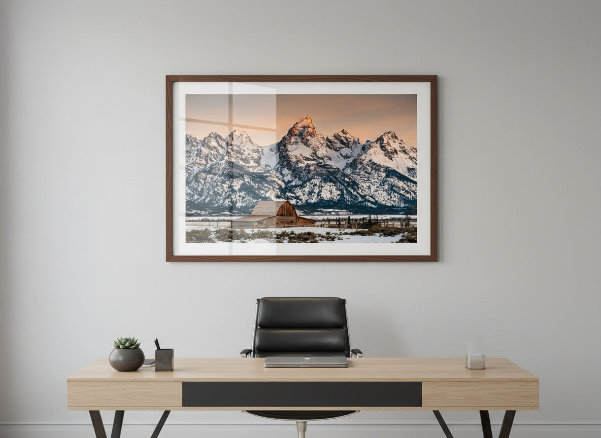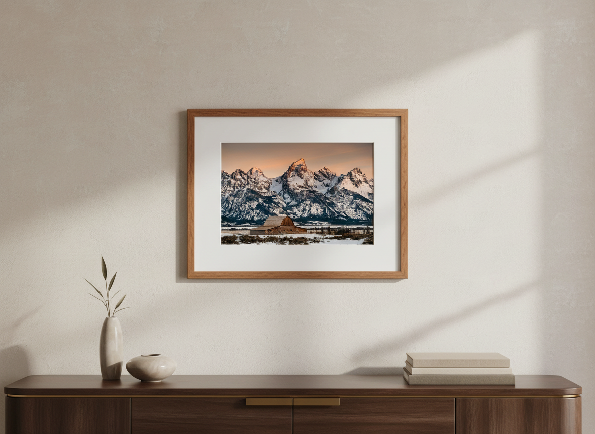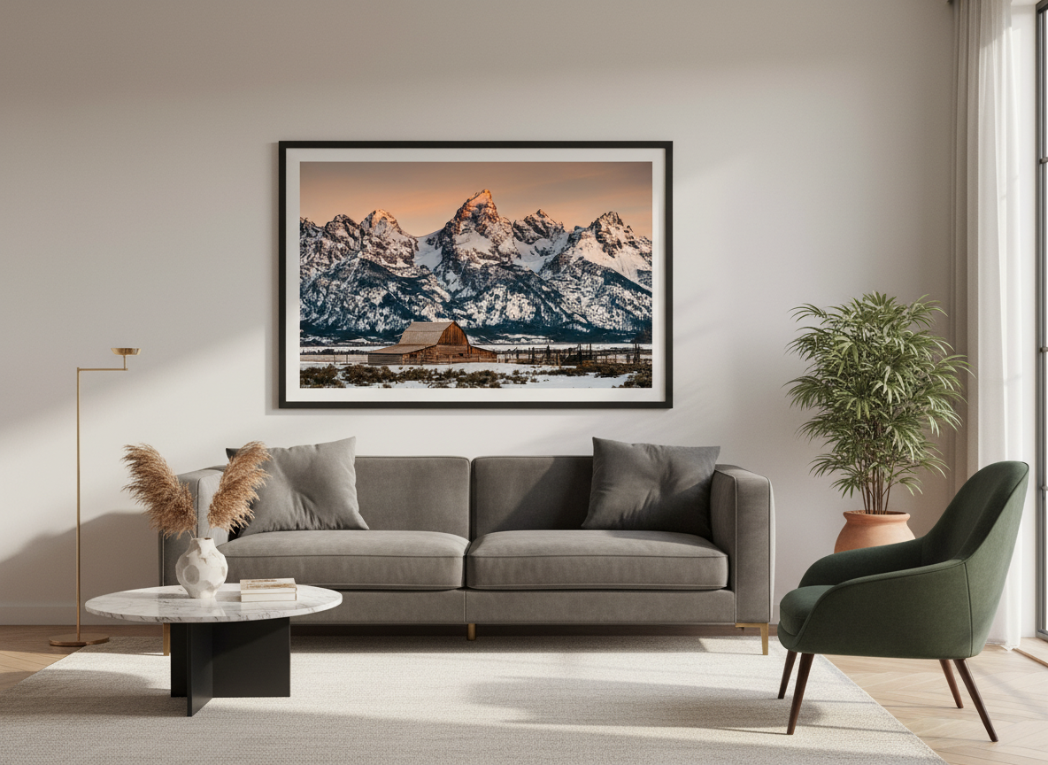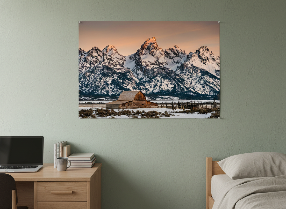 Capture the beauty of Grand Teton National Park with this stunning Moulton Barn Sunrise photograph, featuring the iconic barn and Alpenglow on the Grand Teton.