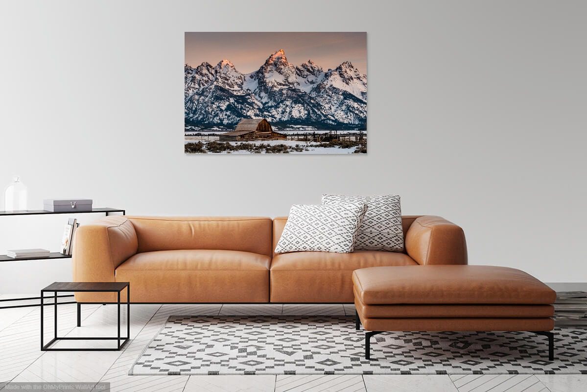 Capture the beauty of Grand Teton National Park with this stunning Moulton Barn Sunrise photograph, featuring the iconic barn and Alpenglow on the Grand Teton.