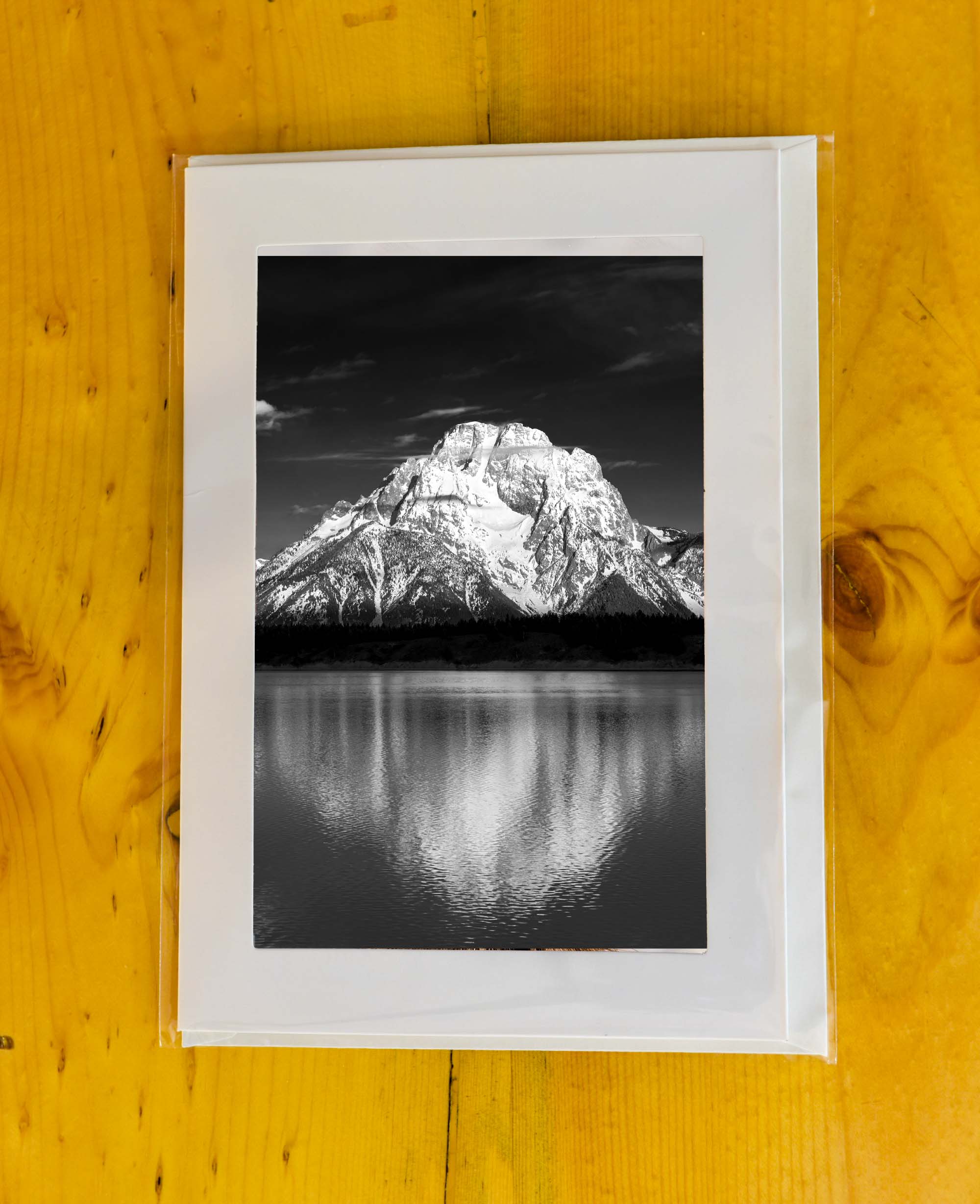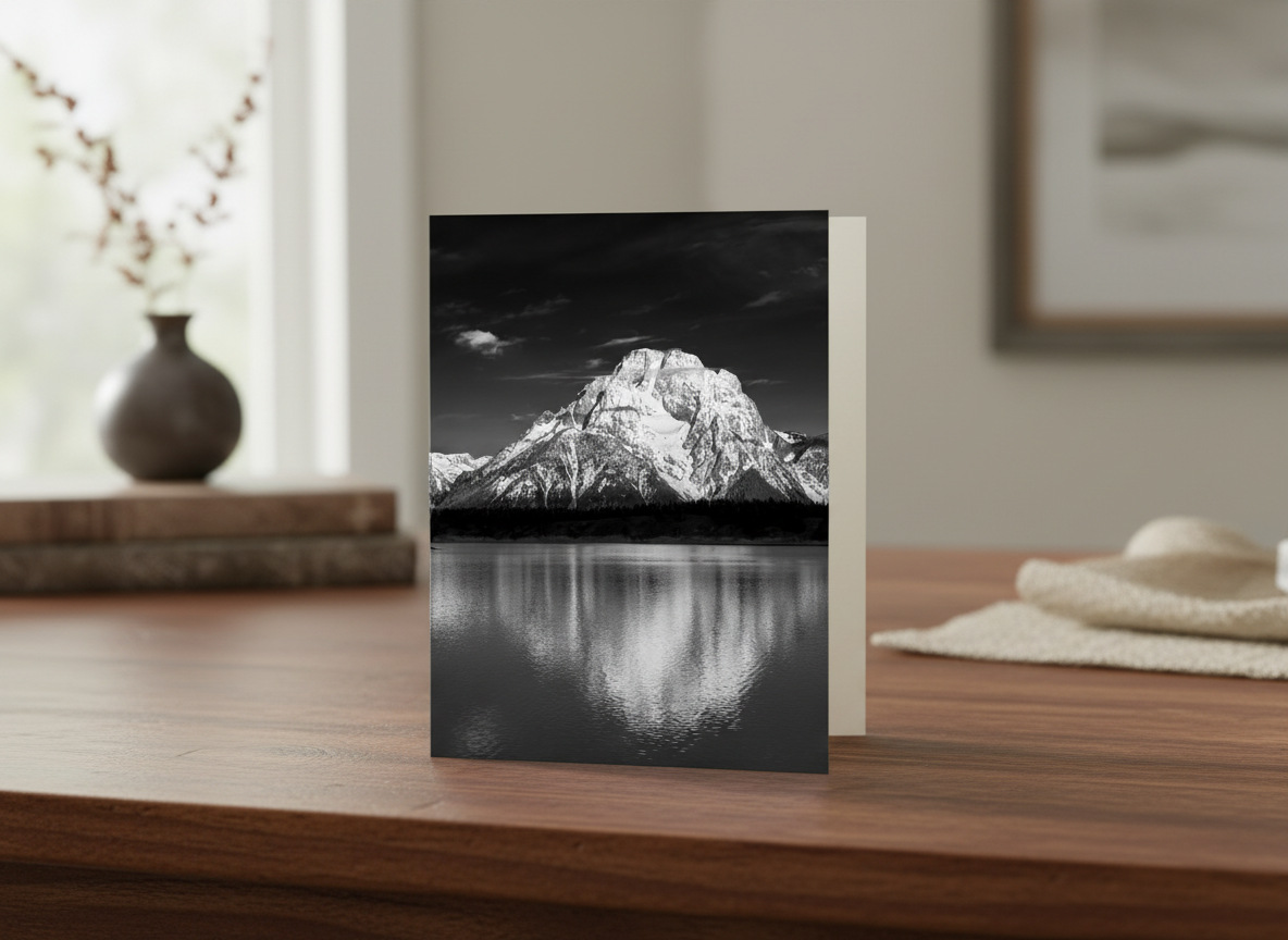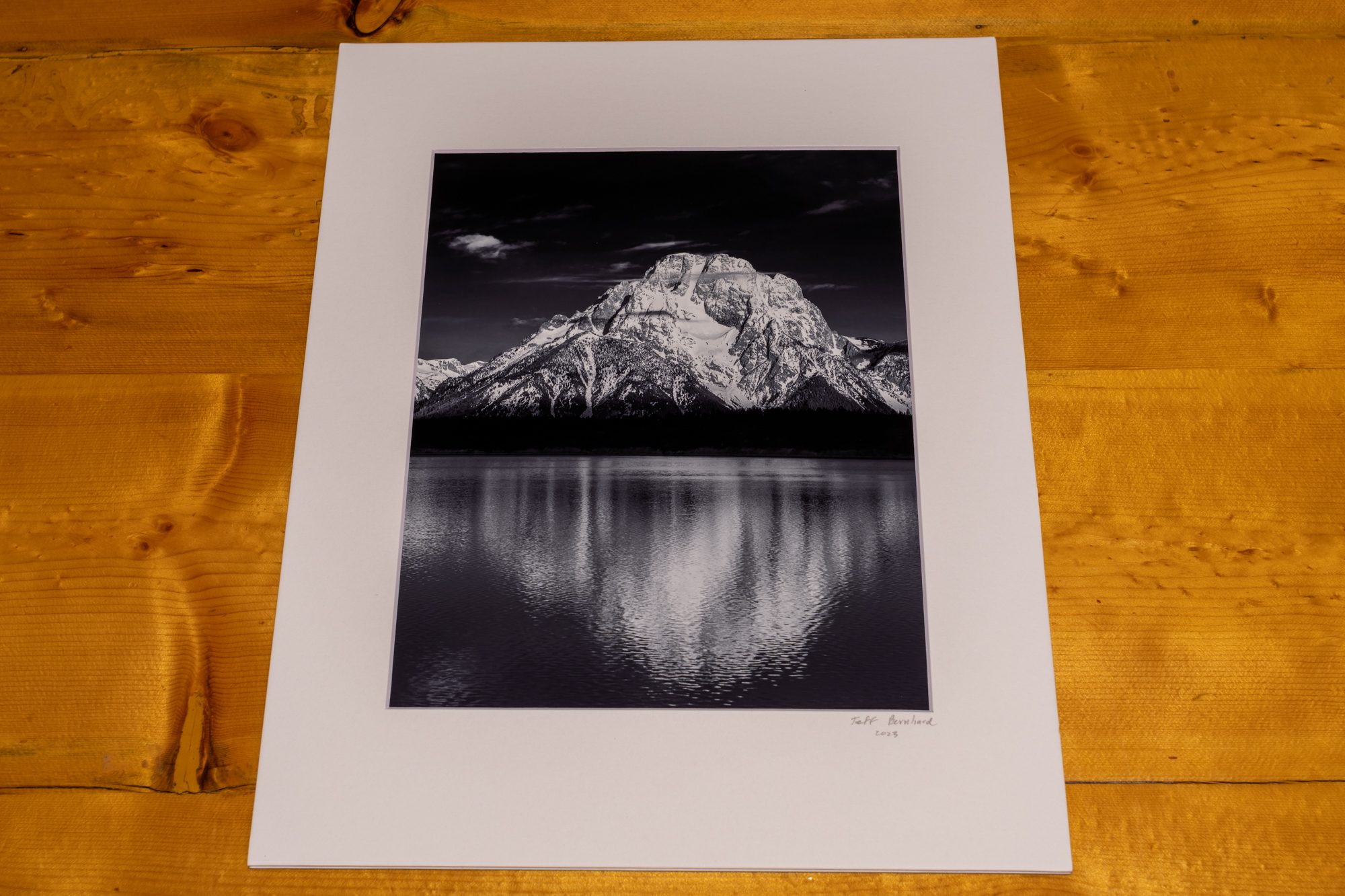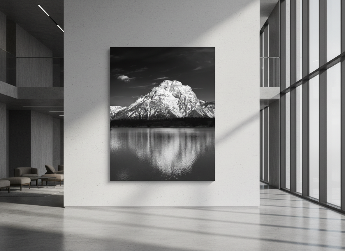 Mount Moran stands as one of the most striking peaks in Grand Teton National Park, its sheer face rising 6,000 feet above Jackson Lake. This black and white photograph captures the mountain’s dramatic presence, enhanced by its glassy reflection in the lake’s calm waters. At 12,610 feet, Mount Moran dominates the northern section of the Tetons, its rugged cliffs and deep geological history making it a favorite among nature lovers and photographers alike. This fine art print showcases the mountain’s timeless beauty, perfect for those who appreciate bold, classic landscapes. Available in various sizes, including custom options, this print is a stunning addition to any space.