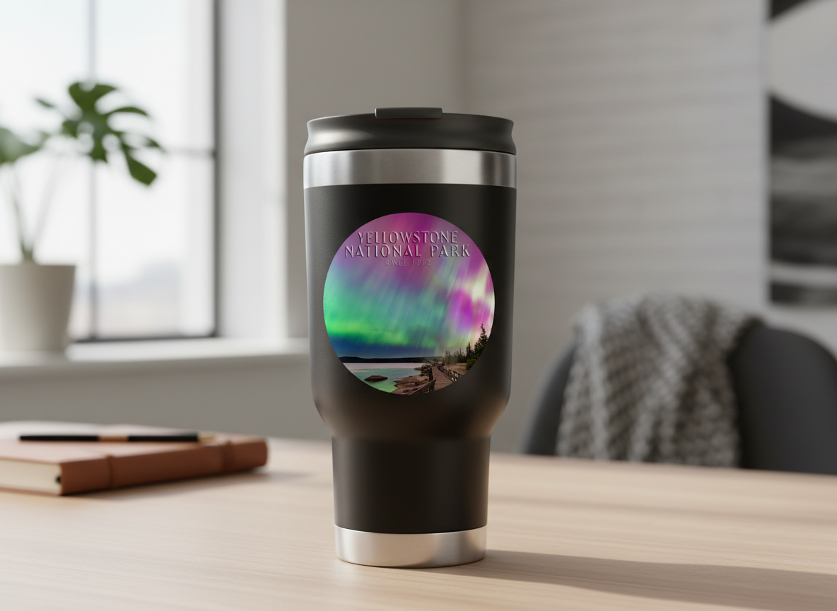 Capture the breathtaking beauty of Yellowstone National Park with this 3″ vinyl sticker, featuring a stunning photograph of the Northern Lights over Yellowstone Lake. The metallic background enhances the mesmerizing colors, while the high-quality vinyl ensures long-lasting durability. Scratch, heat, water, and sunlight-resistant, this sticker is perfect for your laptop, cell phone, water bottle, or any surface you wish to personalize. Made in the USA, it’s a small but striking tribute to one of nature’s most awe-inspiring displays. Add a touch of Yellowstone magic to your everyday accessories today.