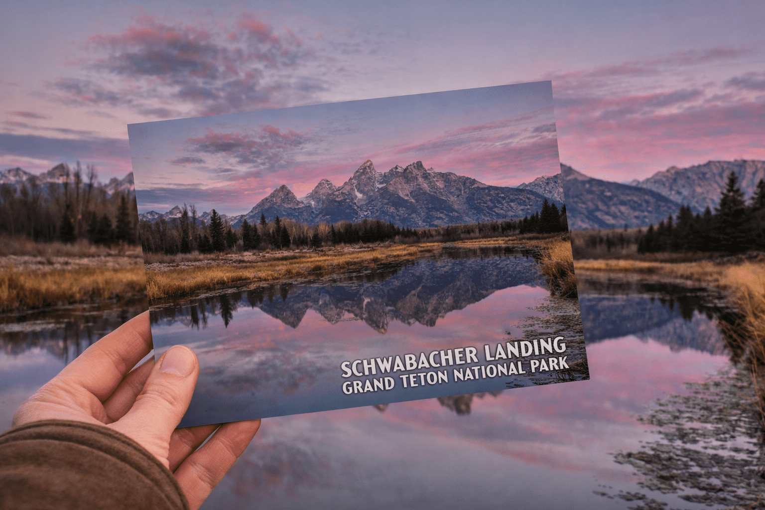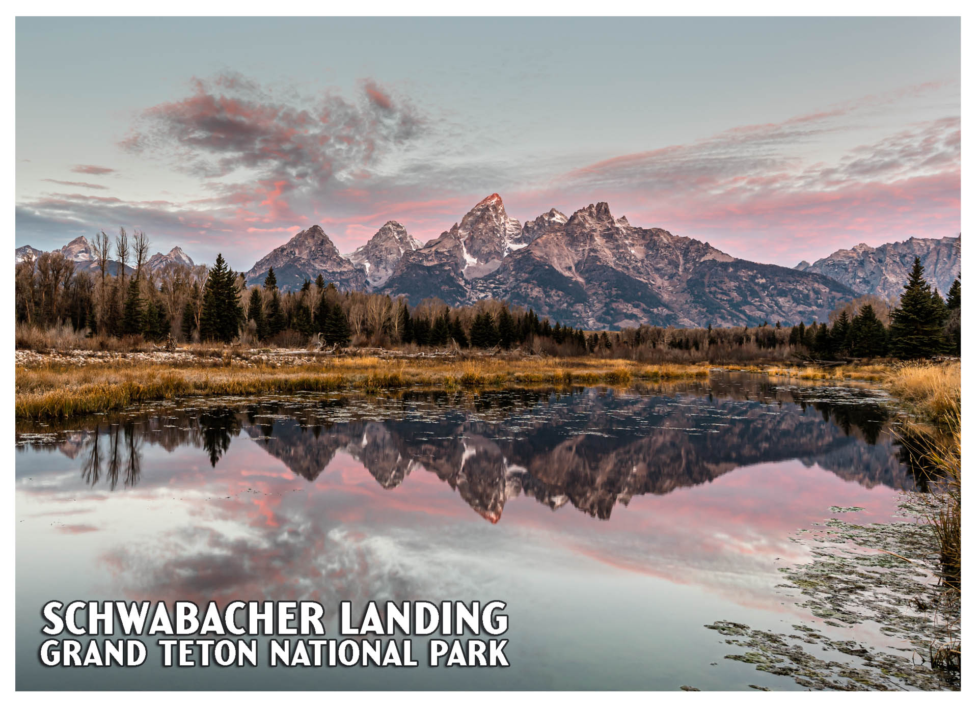 This stunning postcard captures the legendary Schwabacher Landing at sunrise, one of the most photographed and beloved viewpoints in Grand Teton National Park. Soft pink and gold clouds drift above the jagged Teton skyline while the Snake River’s calm water mirrors the entire mountain range below, creating a perfectly balanced natural reflection.
