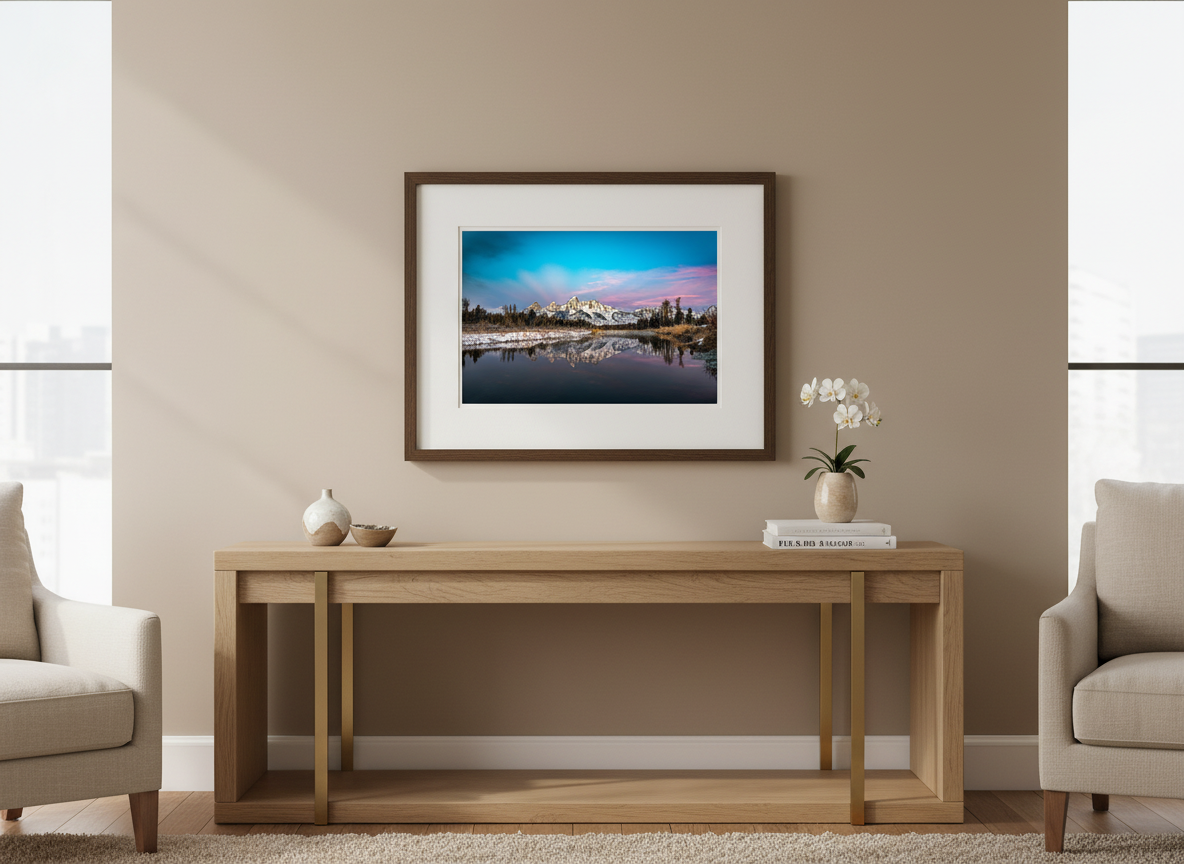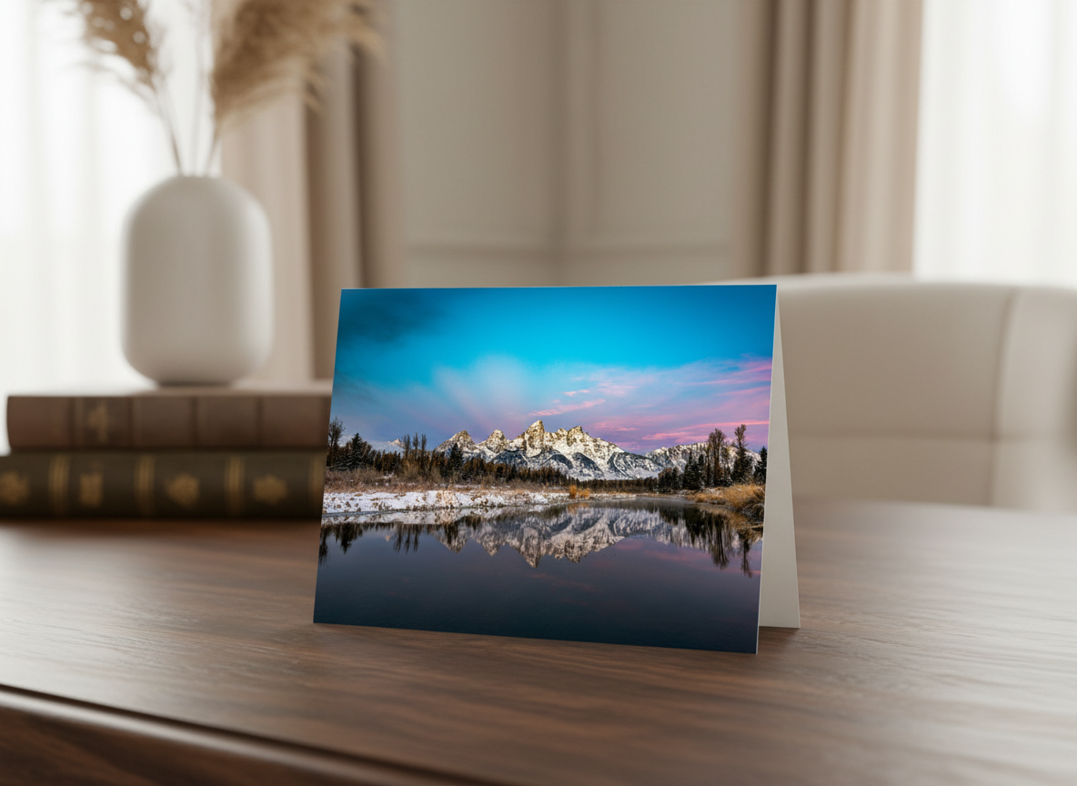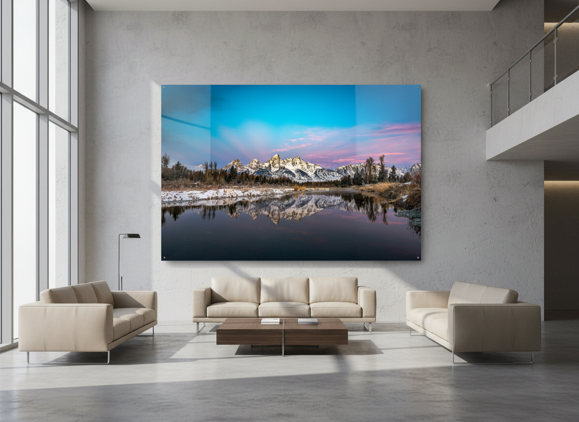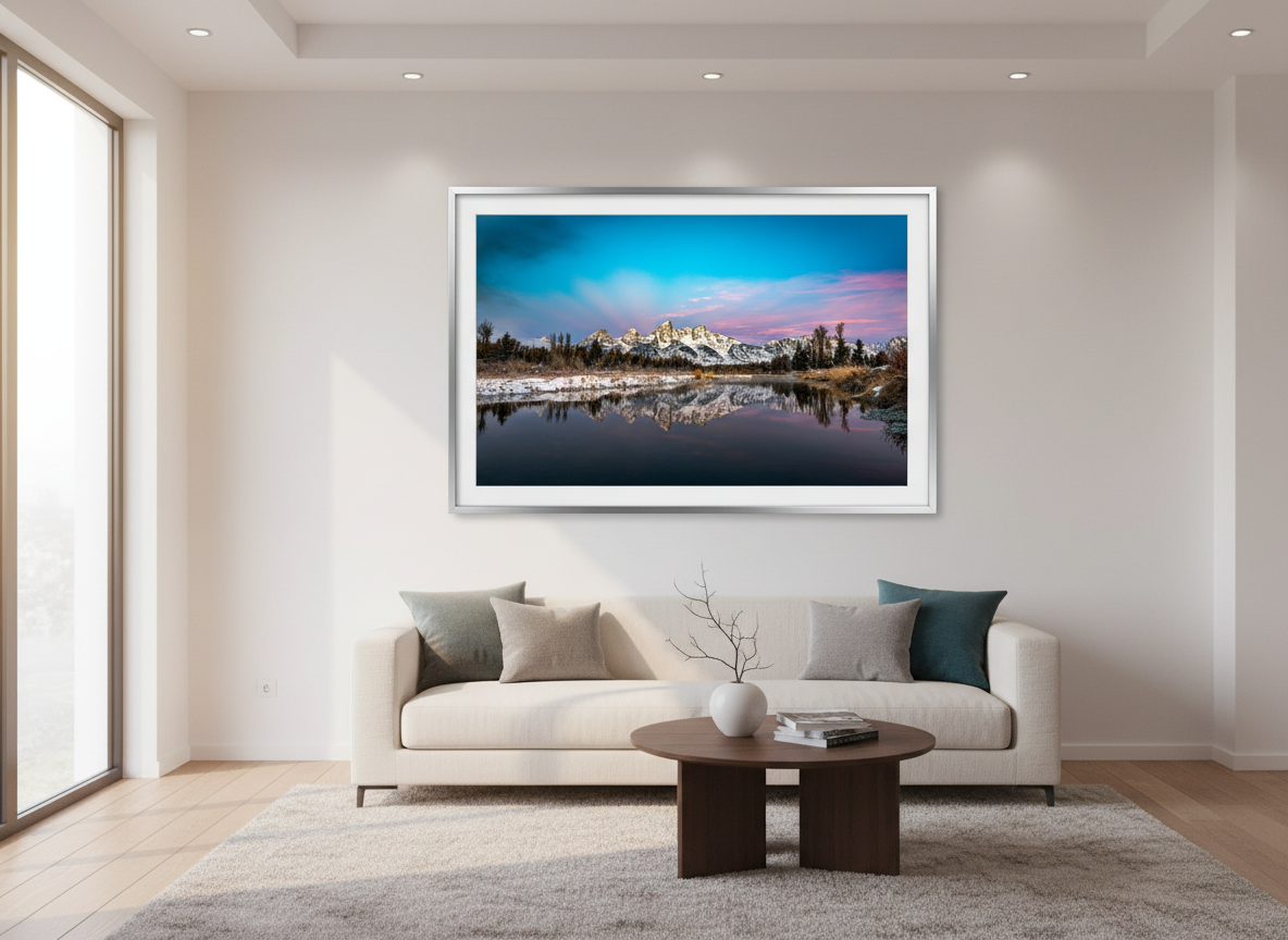 Experience the serene beauty of Schwabacher Landing at sunrise in the heart of Grand Teton National Park. This stunning winter scene captures the Tetons bathed in soft alpenglow, their majestic peaks reflecting in the still waters below. The snow-covered landscape and tranquil blue hour light create a magical atmosphere, making this photograph a perfect addition to any home or office.