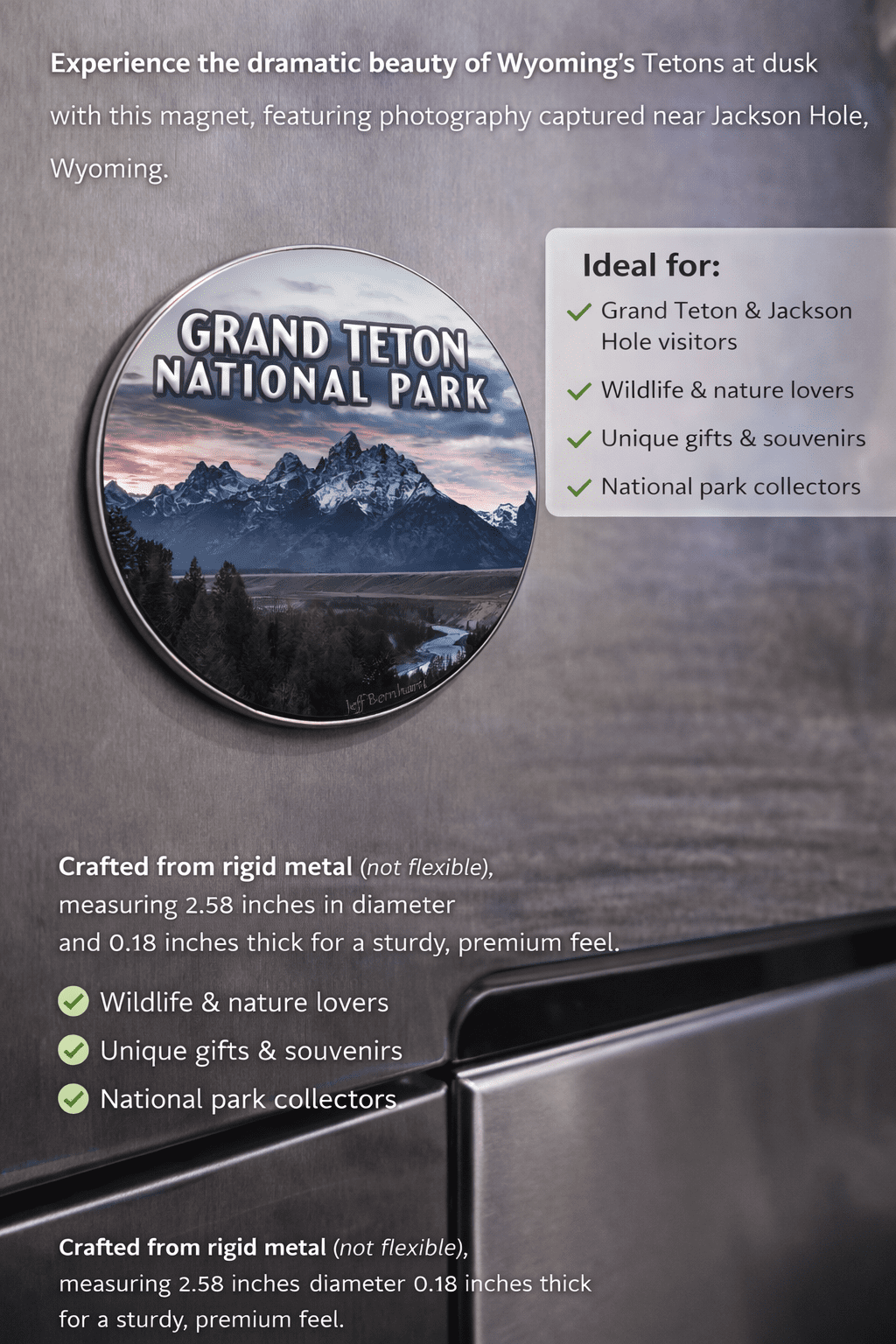 Perfect for refrigerators, lockers, filing cabinets, or any magnetic surface, this magnet makes a meaningful souvenir or gift for anyone who loves national parks, photography, Wyoming, or iconic landscapes.