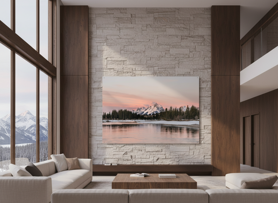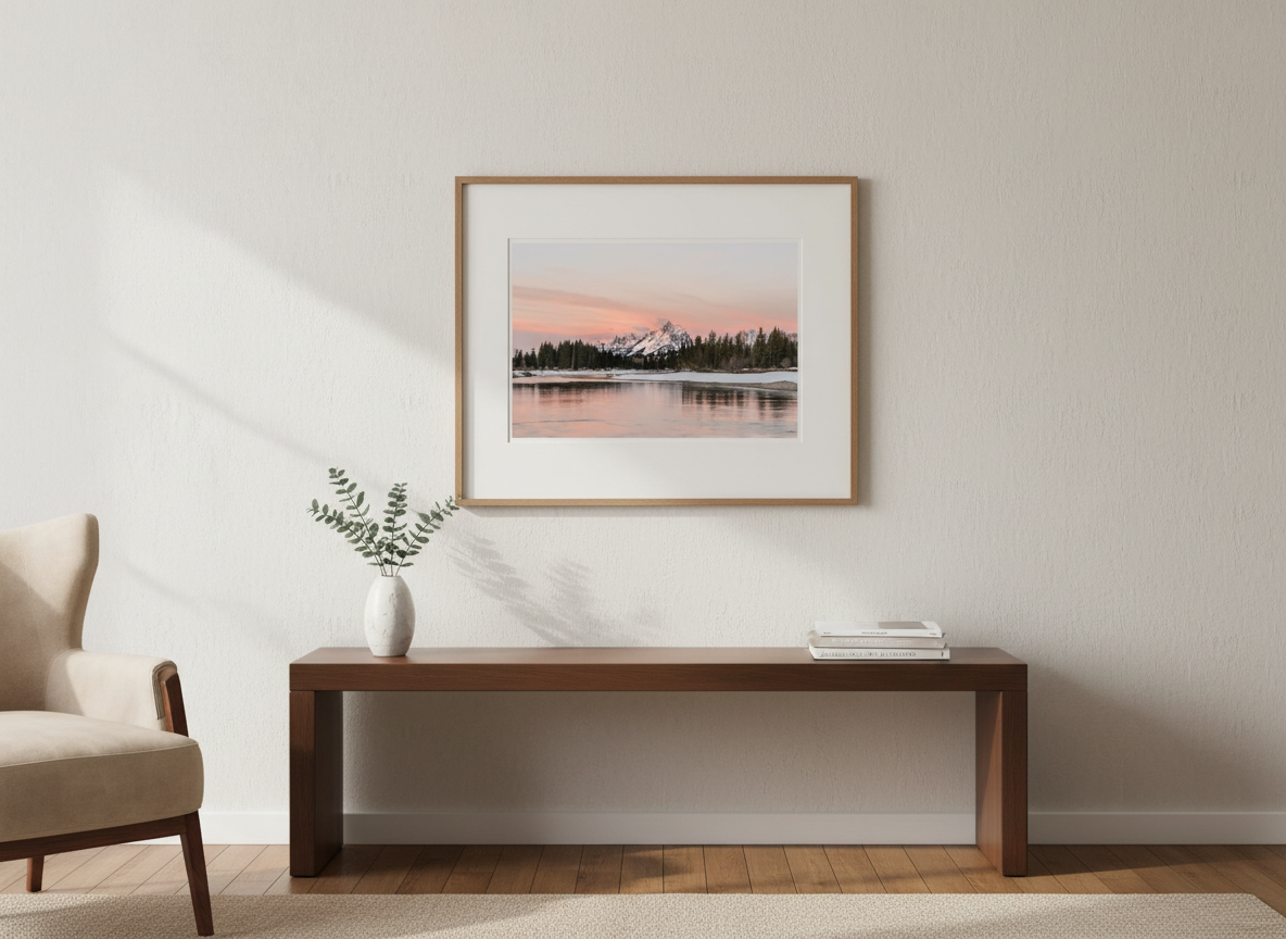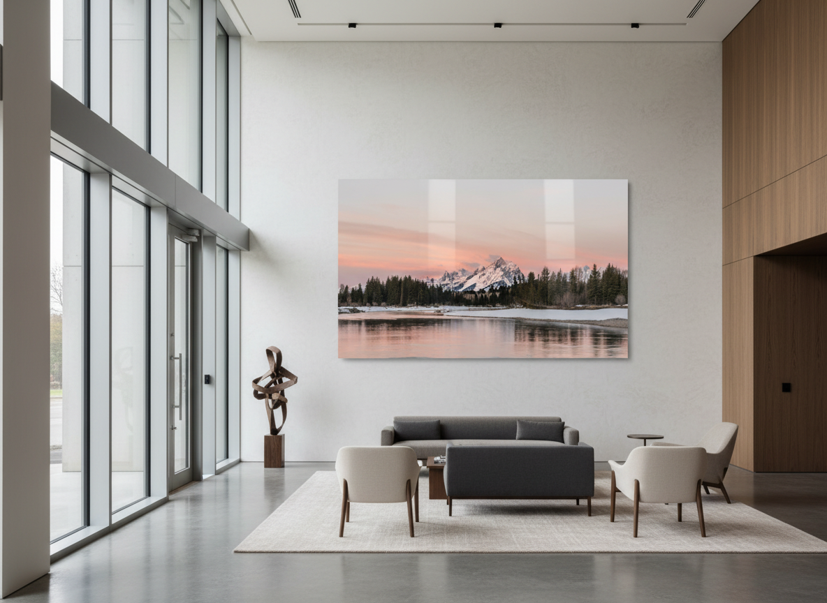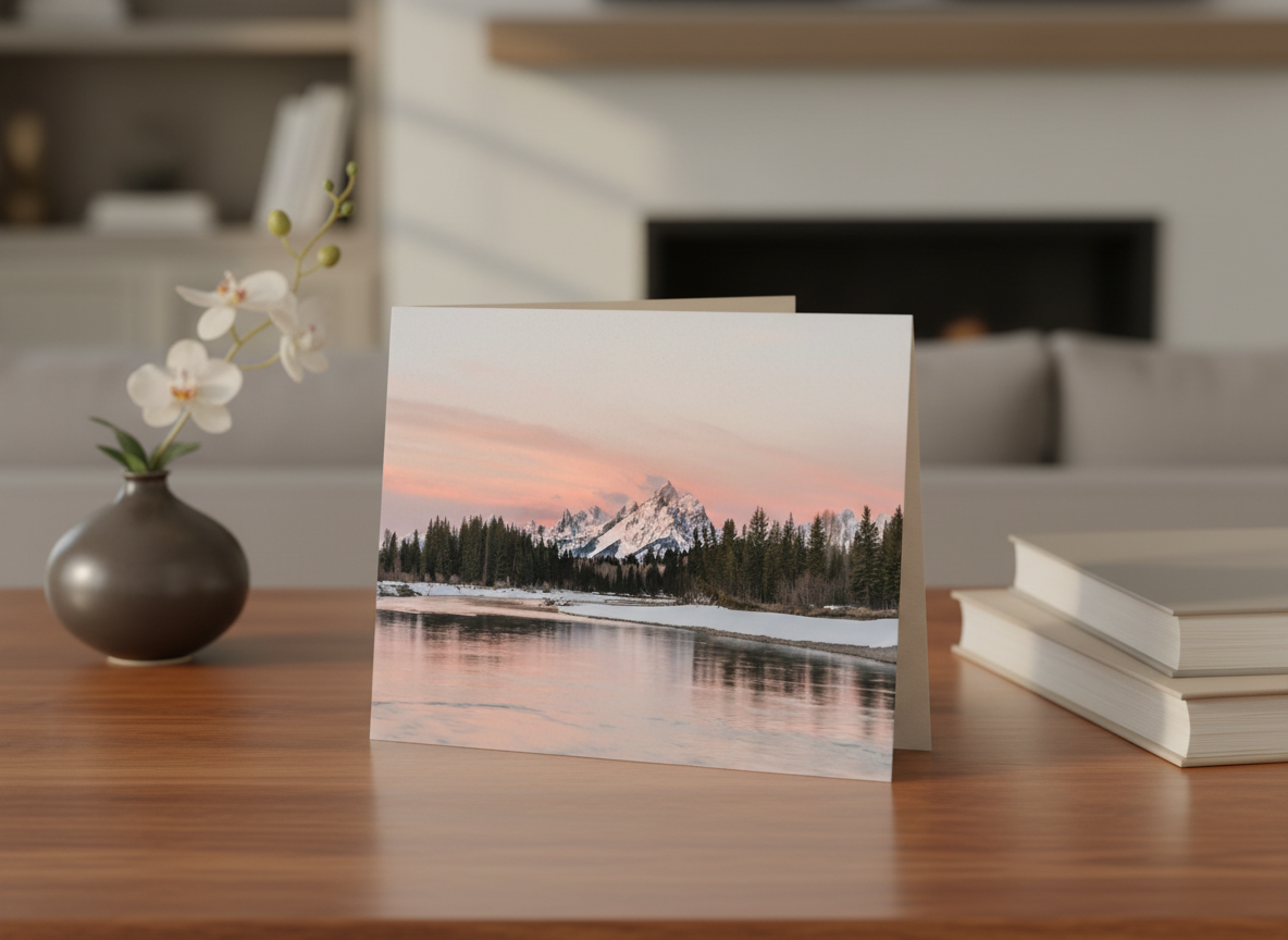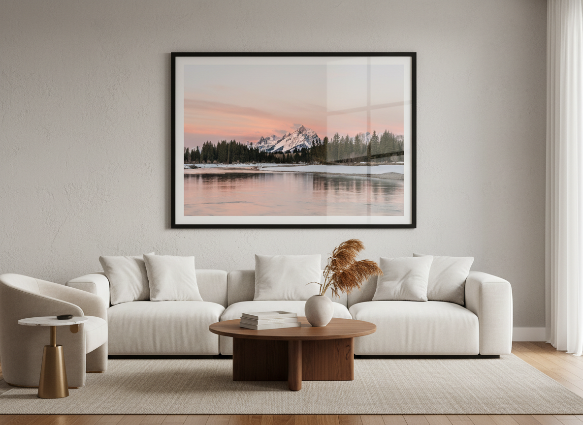 Experience the breathtaking beauty of Grand Teton National Park with this serene sunrise over Snake River, featuring the Tetons bathed in alpenglow.