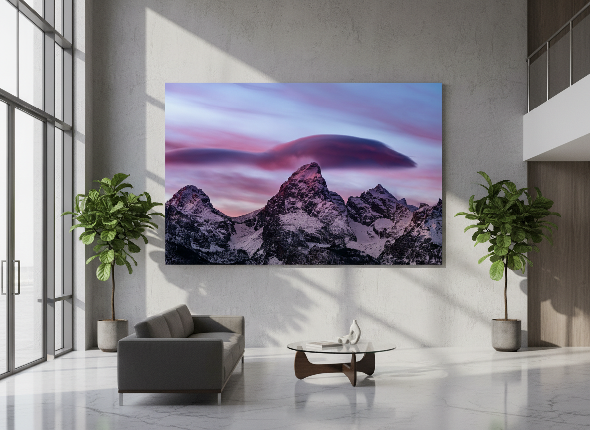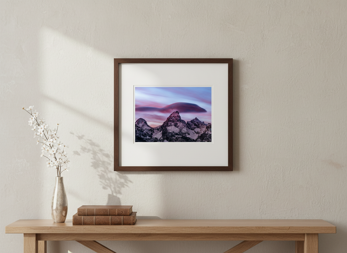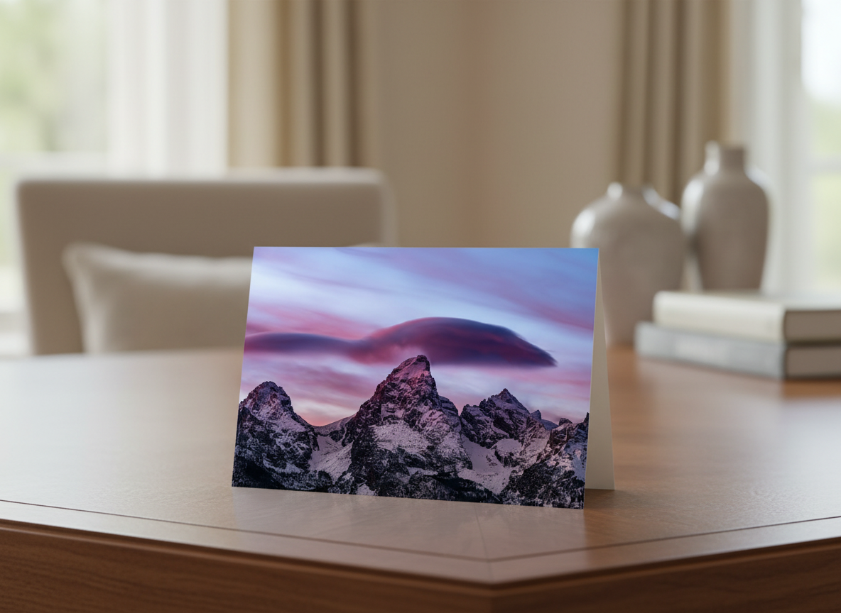 Capture the breathtaking beauty of Grand Teton National Park with this stunning photograph of the Grand Teton at sunset. Vibrant purple lenticular clouds float above the rugged peaks, creating a mesmerizing display of light and color. This open-edition print is available as a folding card or a matted print, hand-signed for authenticity. Each order ships quickly from Moose, WY—inside Grand Teton National Park—so you can bring the magic of the Tetons into your home. Looking for a custom size or medium? Contact me to create the perfect piece for your space.