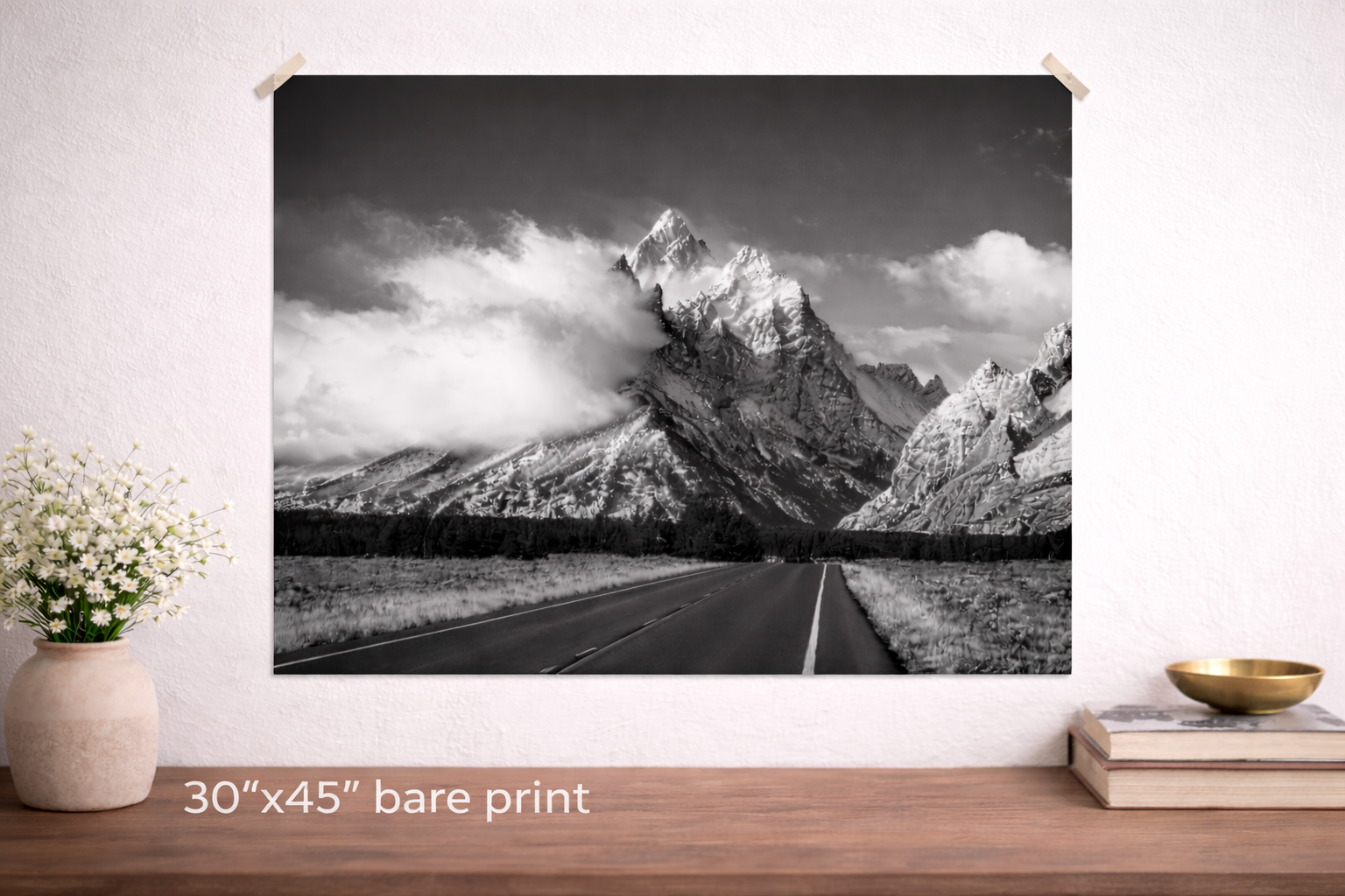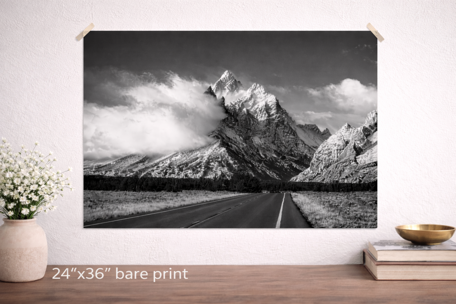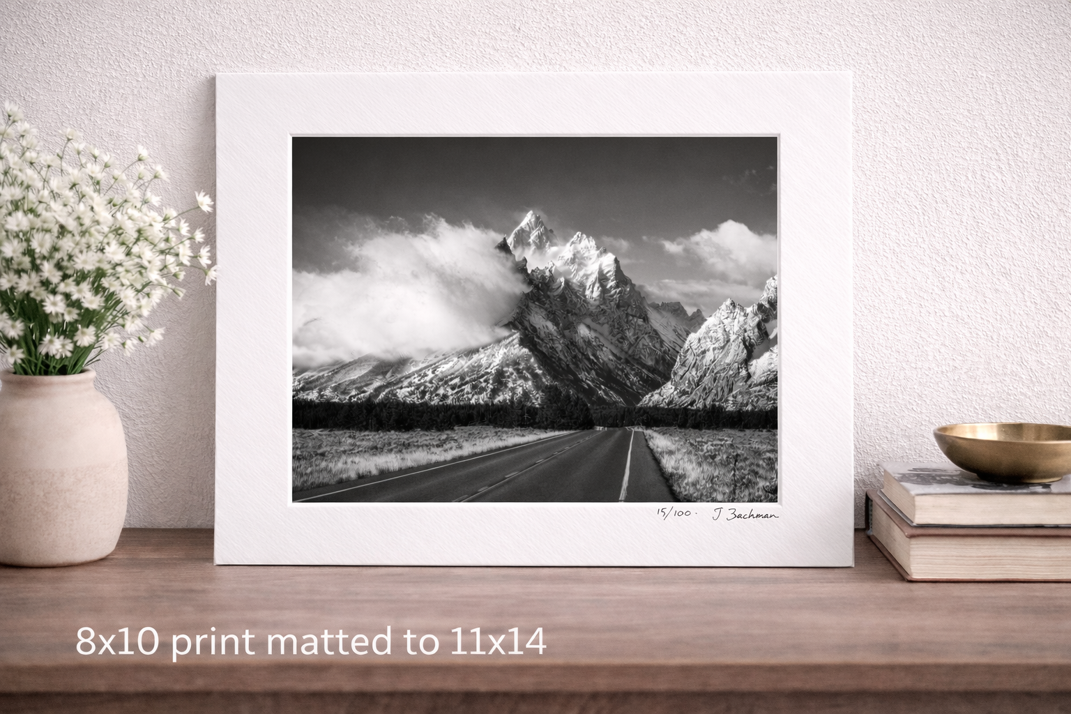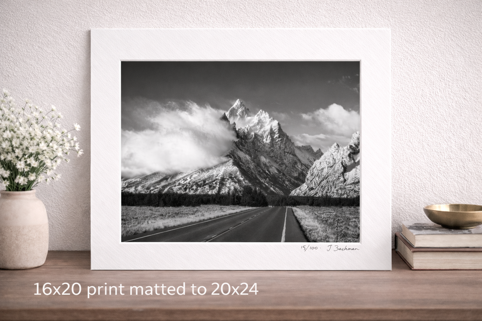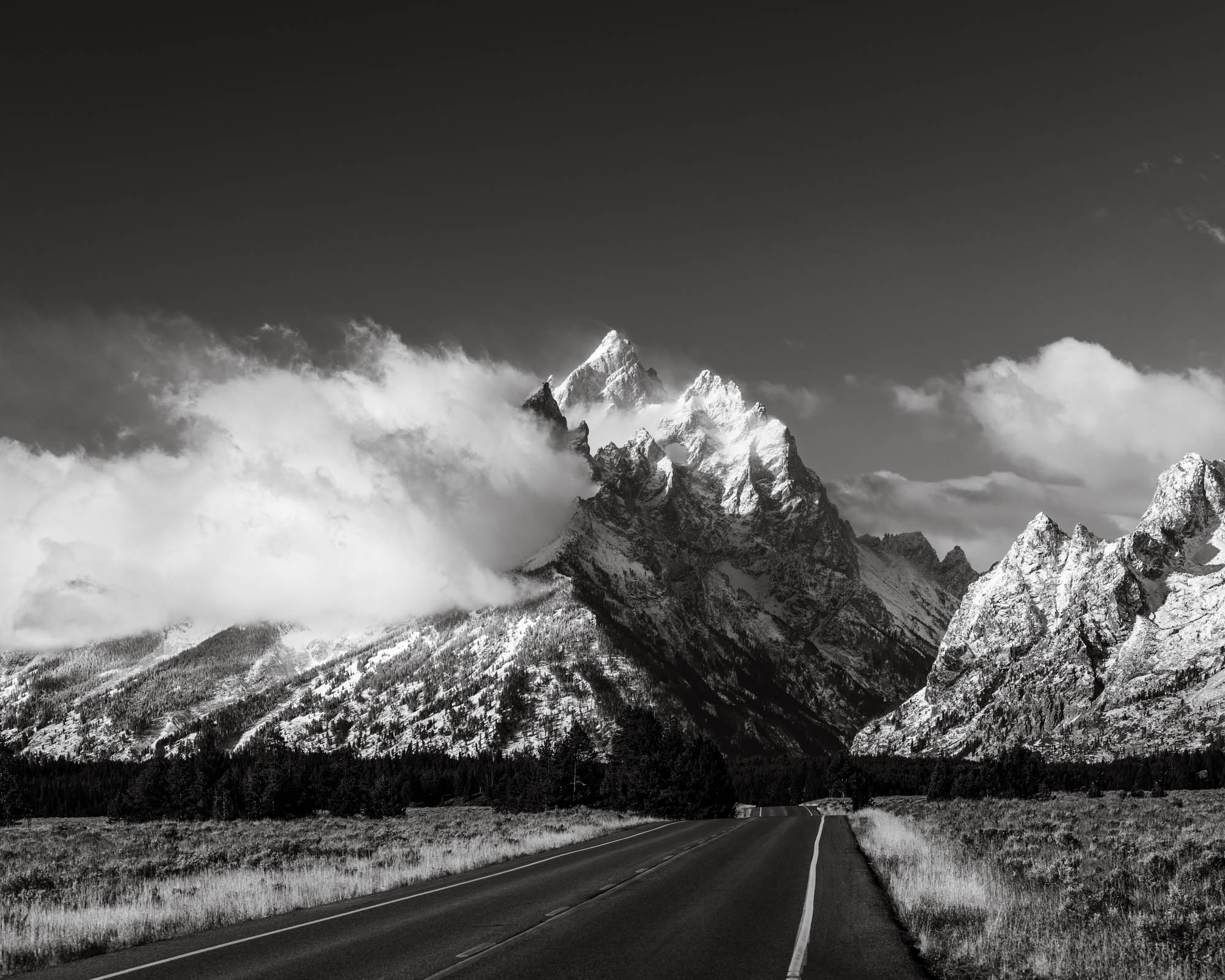 Experience the timeless beauty of Grand Teton National Park with this limited-edition black & white fine art print of Teton Park Road. Captured during a rare north wind event, moisture-rich air rises over the Tetons, forming dramatic clouds that enhance the rugged mountain landscape.