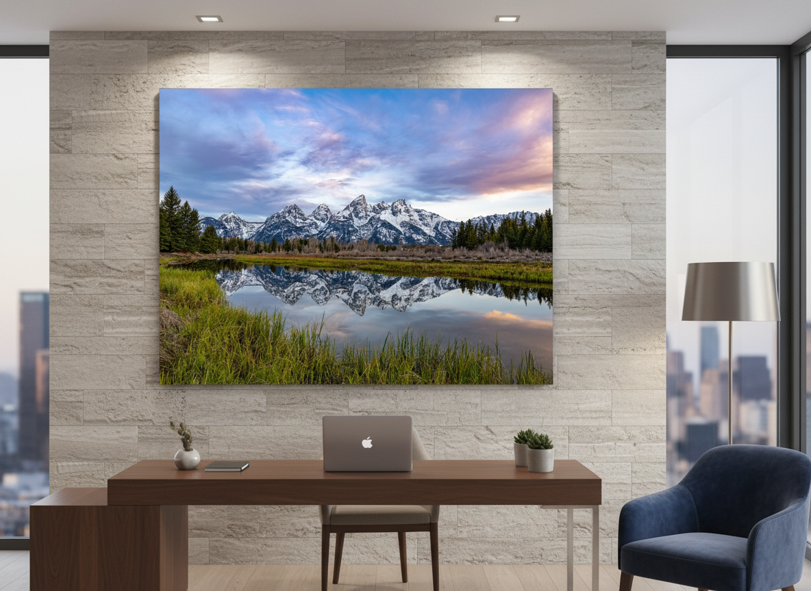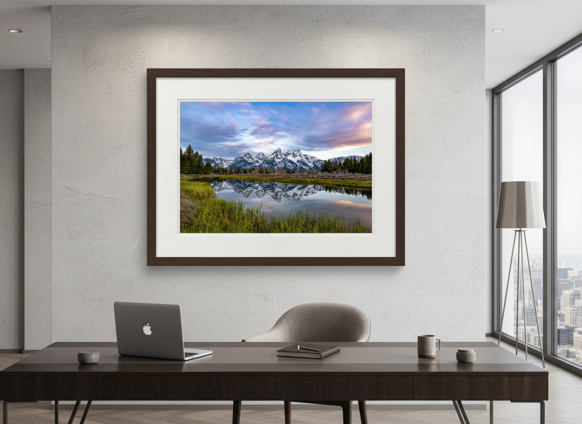 Immerse yourself in the breathtaking beauty of Grand Teton National Park with the “Serene Sunrise in Grand Teton Reflection Photograph.” This captivating image captures the stunning reflection of the jagged Teton peaks in the calm waters of the Snake River at Schwabacher’s Landing. The moody clouds and mirror-like surface evoke a peaceful and timeless moment that draws visitors year-round. Perfect for nature lovers, this photograph is available as an open-edition print in a variety of sizes, from folding cards to large wall art. Custom sizes and mediums are also available to suit your space and style. Bring the serene beauty of this iconic landscape into your home or office today.