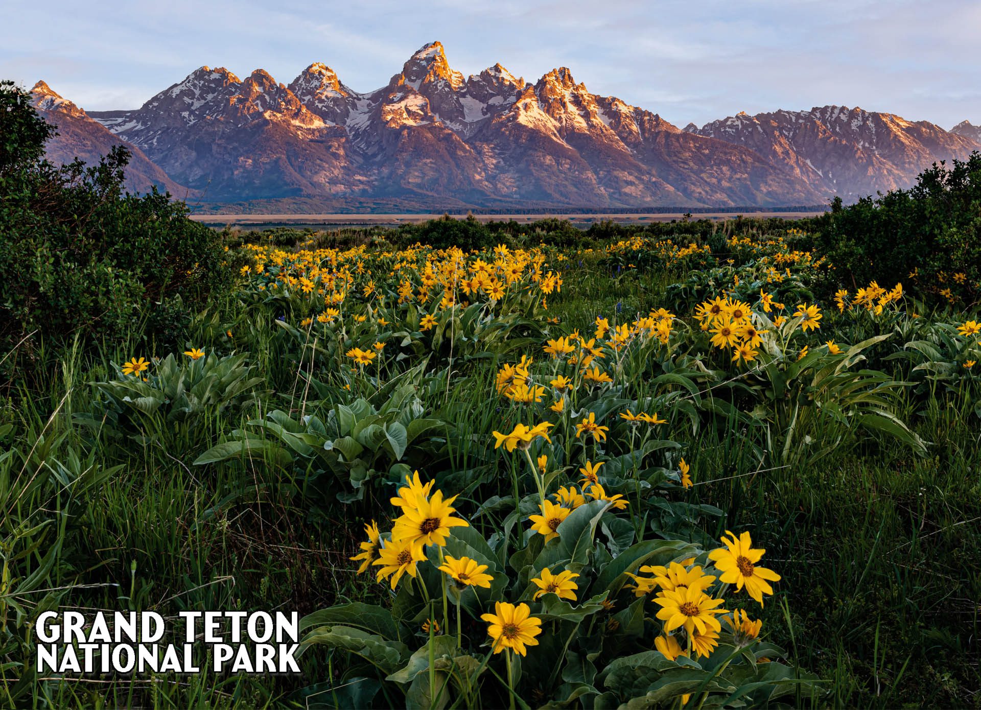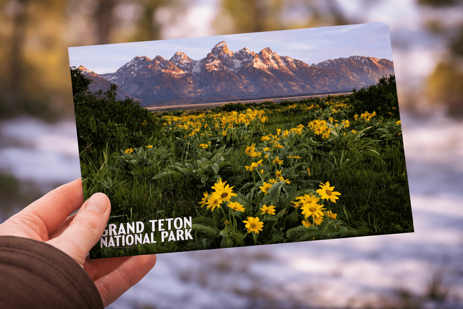 This stunning postcard captures a sweeping field of blooming wildflowers beneath the rugged peaks of the Teton Range, bathed in the golden light of sunrise. The contrast between the soft yellow blossoms and the dramatic alpine skyline creates a timeless portrait of spring in Grand Teton National Park.