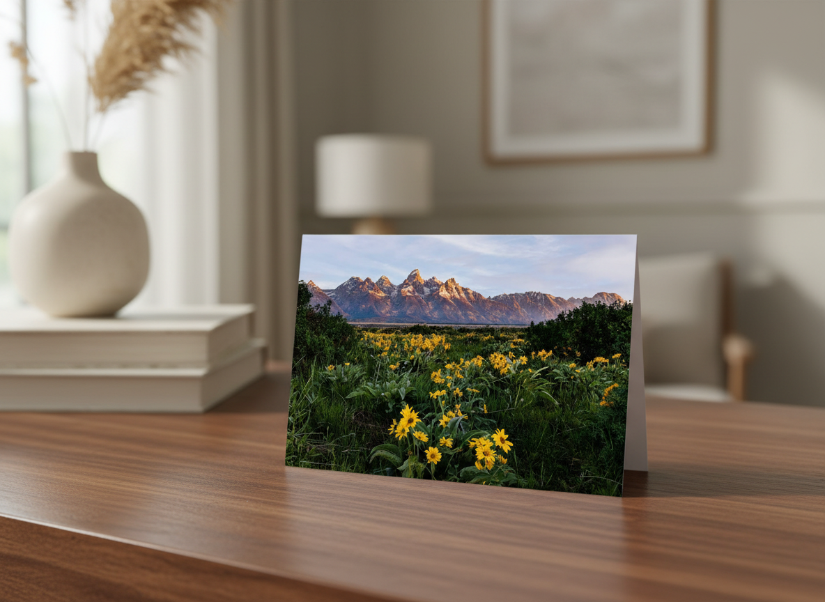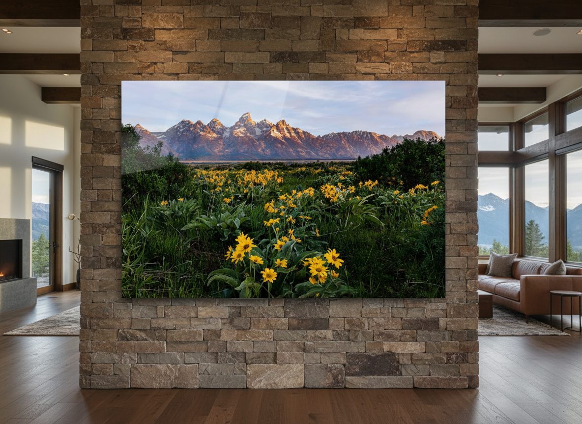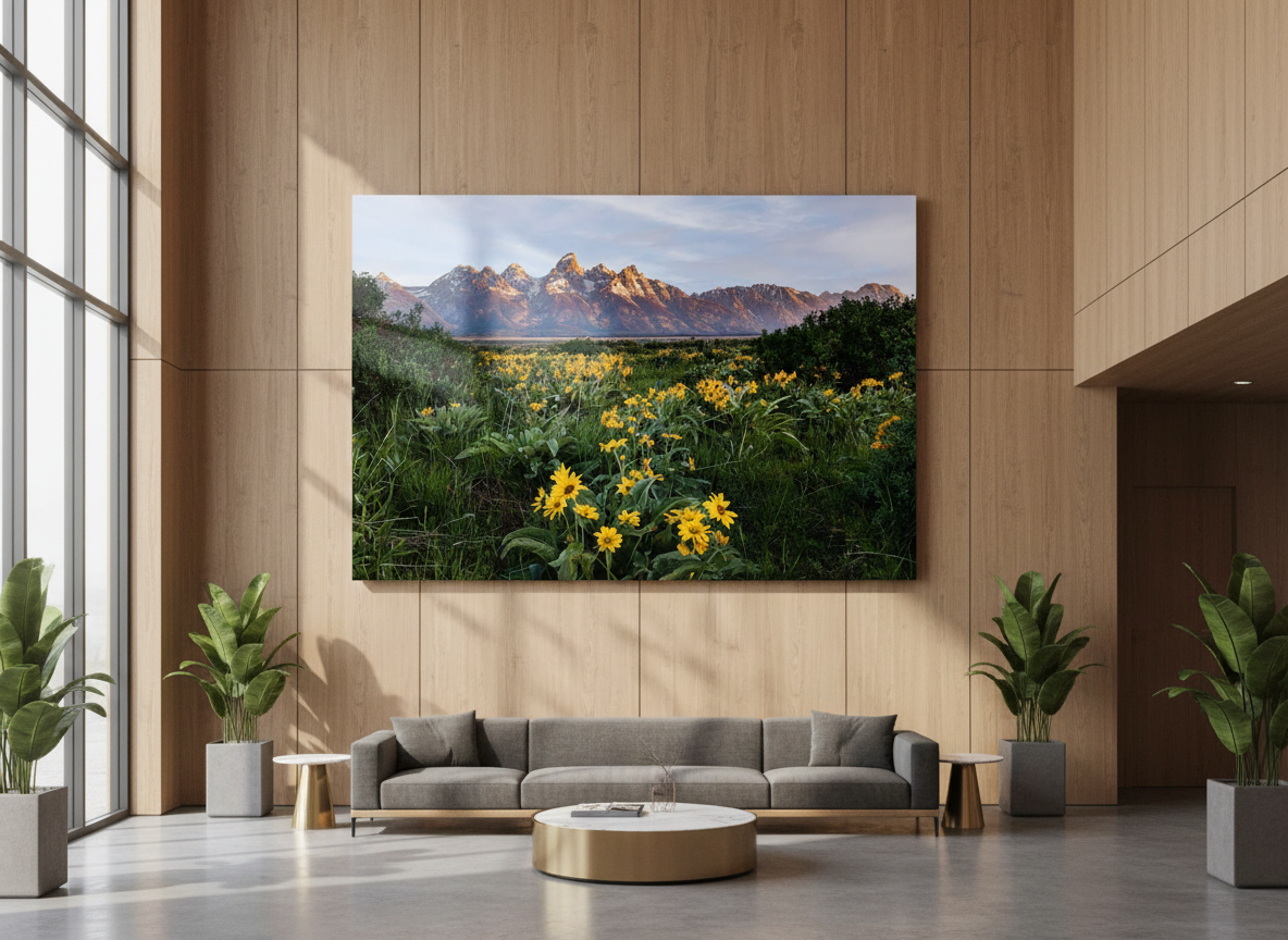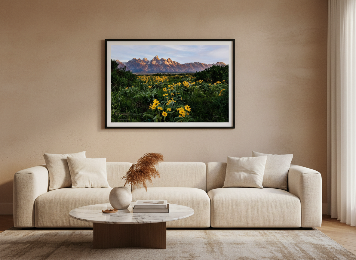 Experience the vibrant beauty of Grand Teton National Park with this stunning photograph of Arrowleaf Balsamroot wildflowers at sunrise. Captured from the historic Mormon Row, this image showcases the fleeting but magical wildflower season that spans from May to September. With only about 60 frost-free days in Jackson Hole, wildflowers bloom quickly and disappear just as fast, making each moment a rare treasure. The blooms provide essential habitat and food for wildlife, and it’s important to preserve them for future visitors by leaving them undisturbed. Perfect for nature lovers and those who appreciate the beauty of Wyoming’s wild landscapes, this image brings the colors of the Tetons into your home.