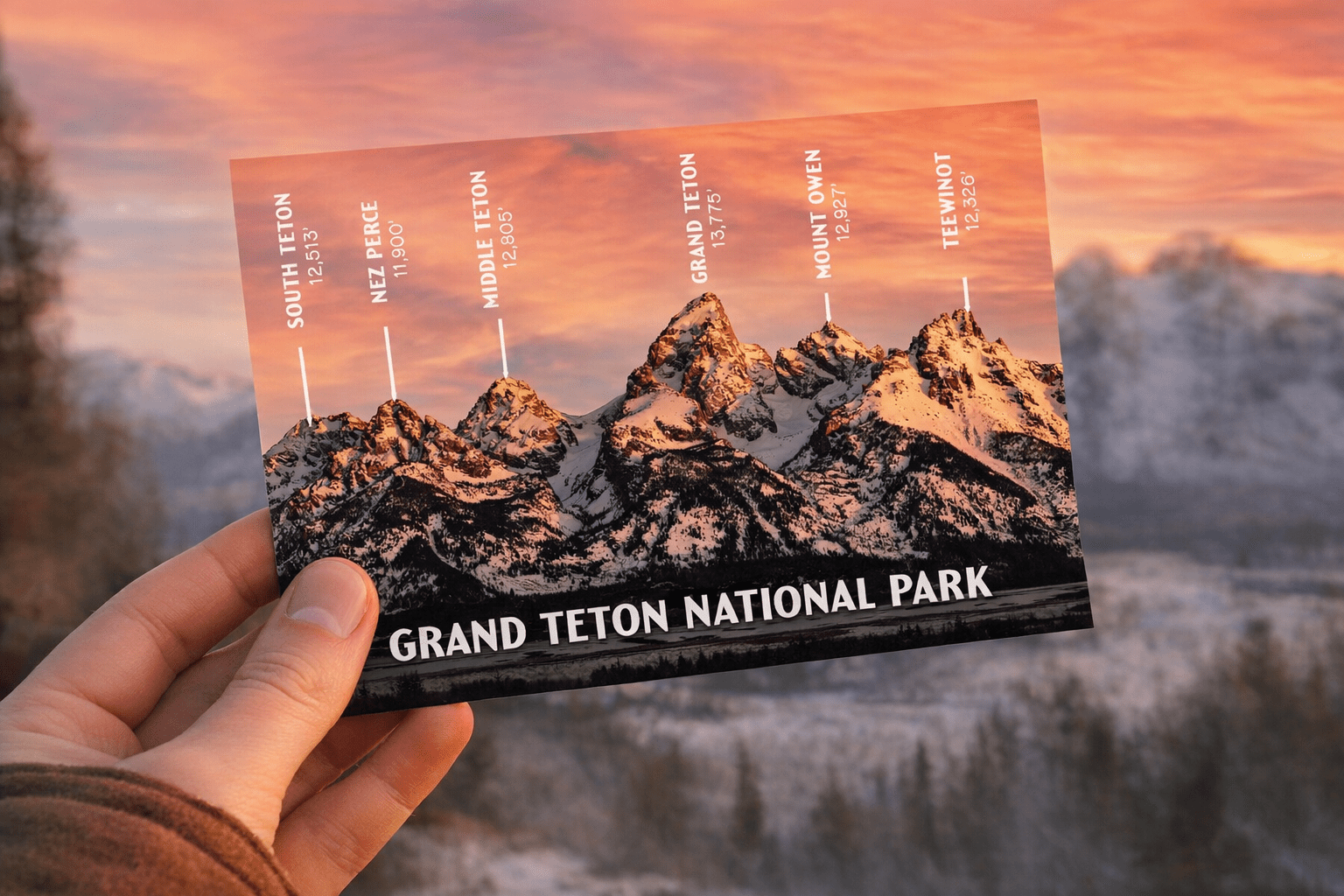 Designed to be both a work of art and a practical reference, this postcard makes a perfect souvenir, gift, or keepsake for visitors, hikers, photographers, and mountain lovers. The warm alpenglow colors combined with crisp typography create a striking composition that captures the scale and majesty of Grand Teton National Park while providing meaningful context to the landscape.