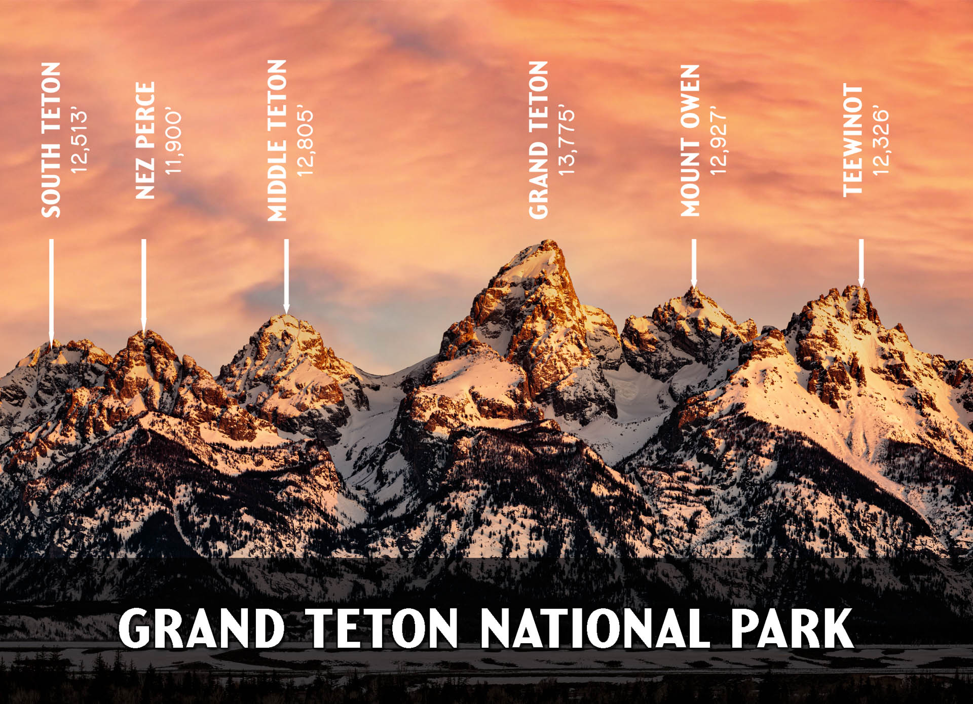 This premium Tetons with Labels postcard showcases the dramatic skyline of the Teton Range at sunset, with major peaks clearly identified — including Grand Teton, Mount Owen, Teewinot, Middle Teton, Nez Perce, and South Teton, along with their elevations.