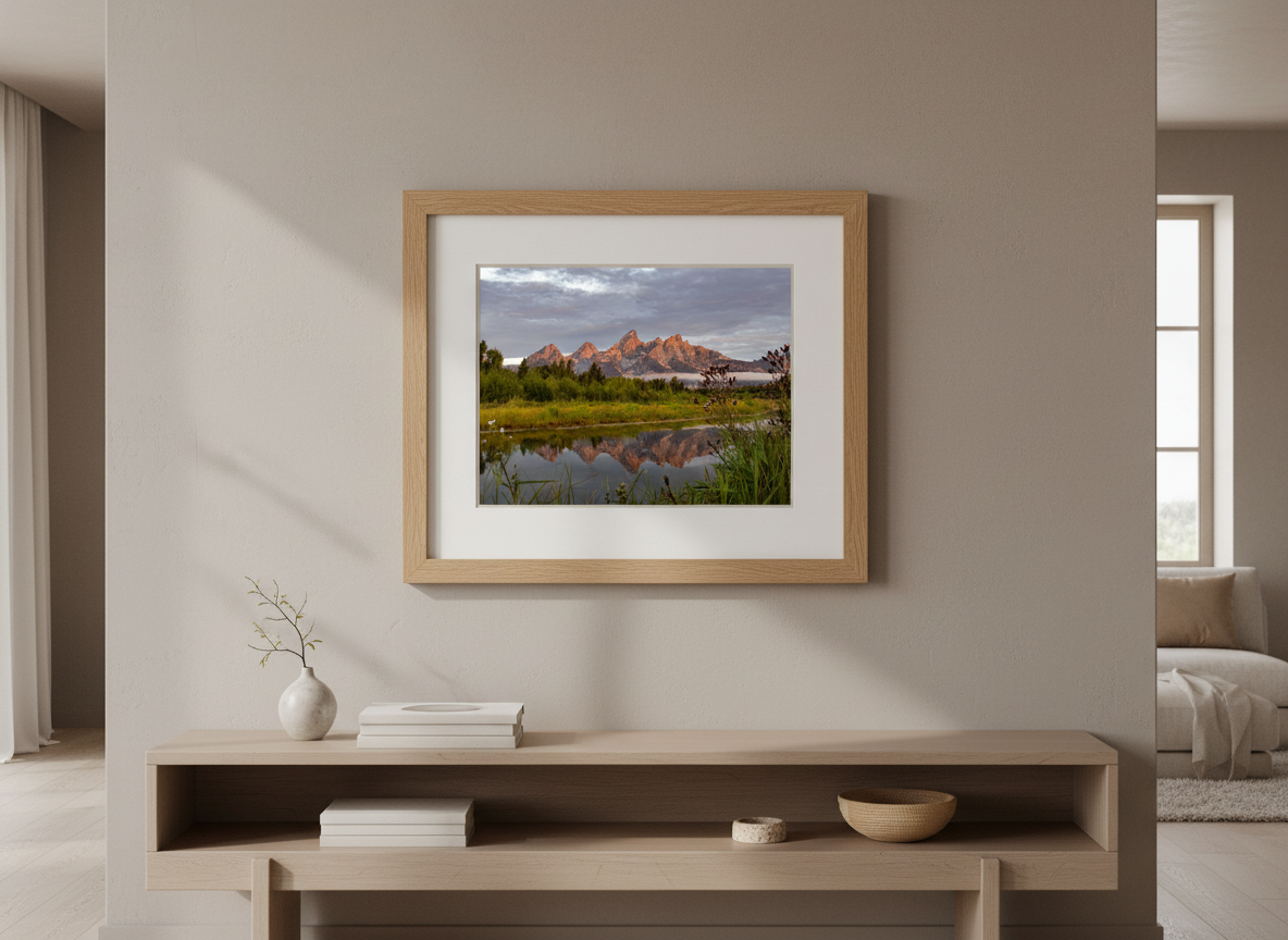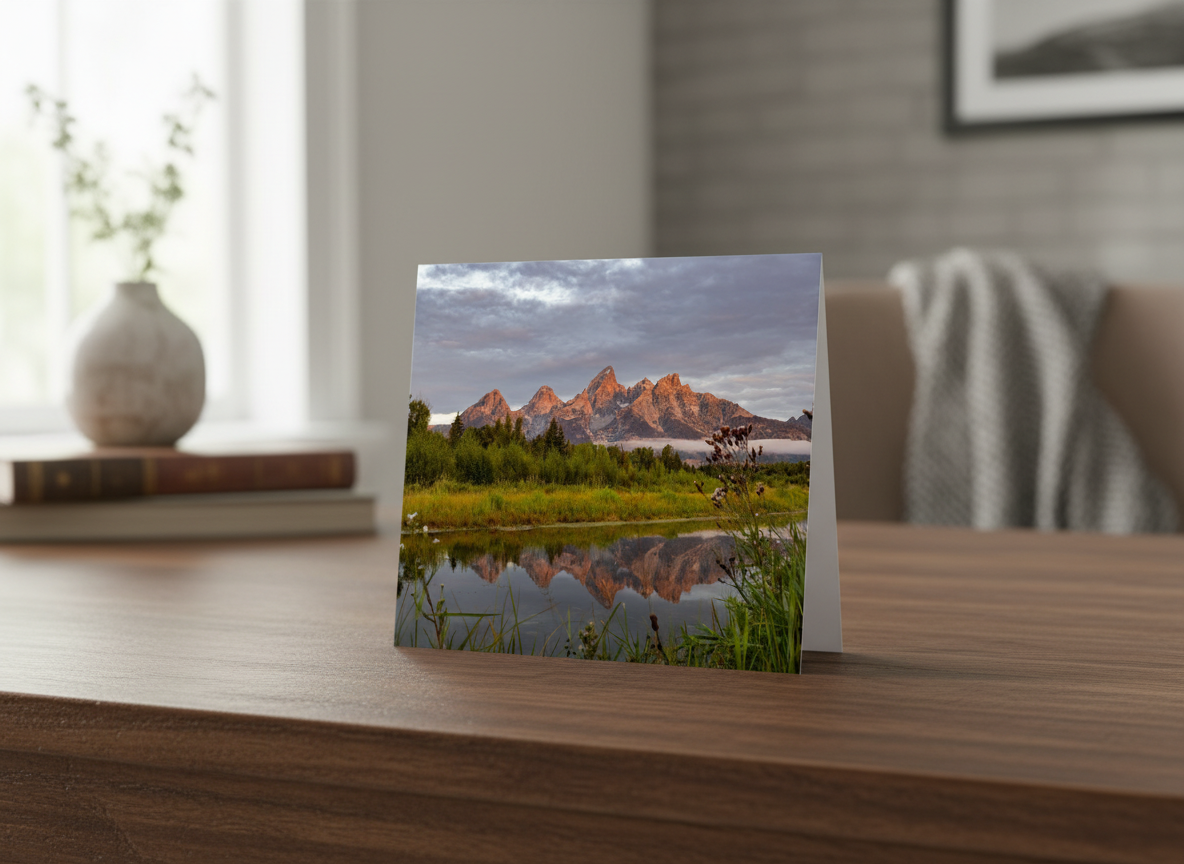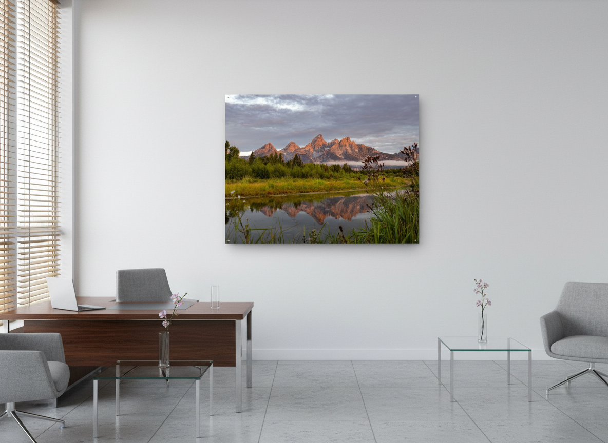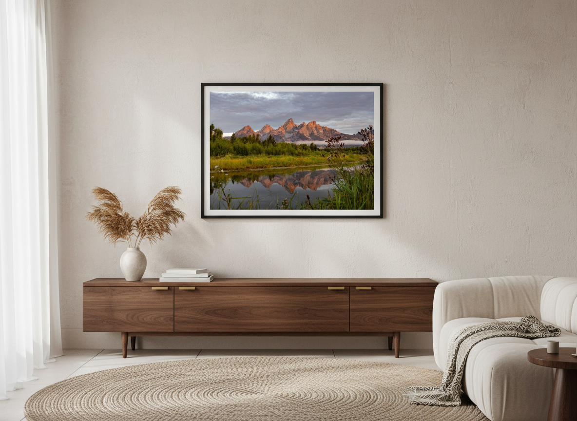Capture the breathtaking tranquility of a Teton sunrise with this stunning photograph, taken at Schwabacher Landing in Grand Teton National Park. The calm waters, formed by a beaver dam, create a dreamy reflection of the rugged mountains, bathed in the warm light of the first morning rays. This iconic location, once a boat launch, continues to captivate visitors with its serene beauty. Whether you’re a local or an admirer from afar, this open-edition print brings the majestic allure of the Tetons into your home or office.