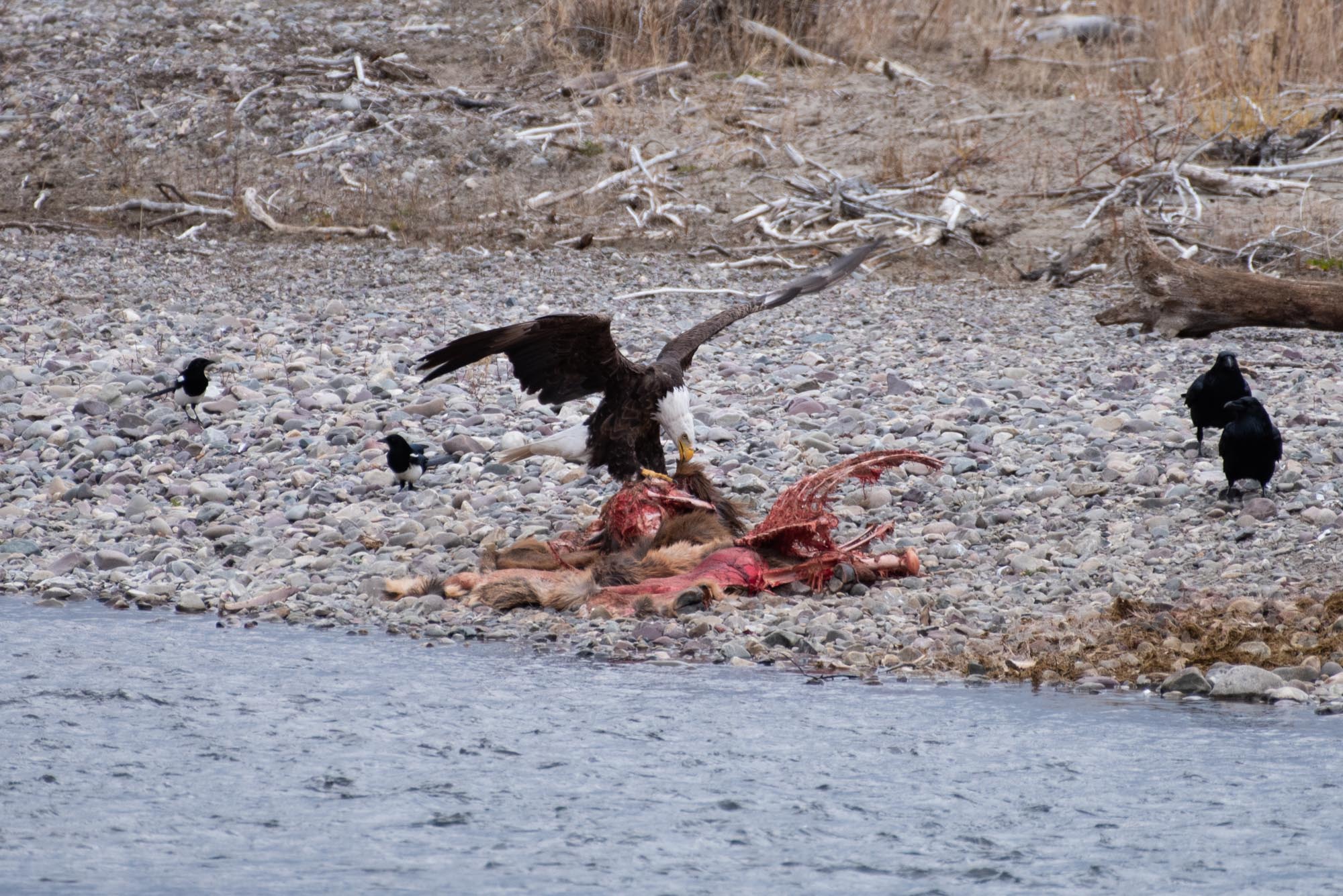 I have seen wolves around over the past 12 years of living and working in Grand Teton National Park. The sightings were always very brief and from a great distance. That all changed yesterday, November 14th 2021. A carcass was visible from the roadway. A recent kill, most likely an elk by the look of it. I decided to wait all day, watching as a pair of coyotes and a bald eagle briefly made an appearance, but for the most part a group of ravens had the meal to themselves.